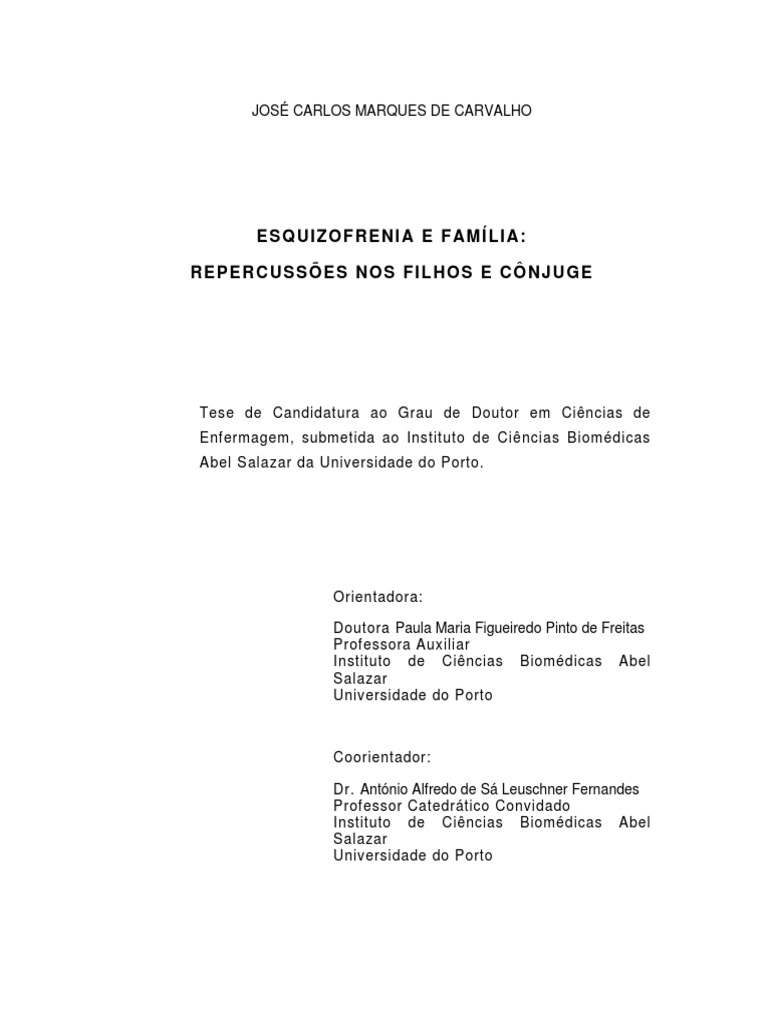 Camacho, E., Len, E. & Uribe, M. (2005). Crianza y esquizofrenia. Salud Mental, 28(2), 59-72. Campos, L. (2002). Adaptao psicossocial parental deficincia mental. (Dissertao de mestrado, Universidade do Porto, 2002). Campos, L. (2008). Os caminhos das experincias positivas e negativas na prestao de cuidados informais na esquizofrenia. (Tese de doutoramento, Universidade do Porto, 2008). Campos, L. (2009). Doena mental e a prestao de cuidados. Lisboa: Universidade Catlica. Canavarro, M. C., Vaz Serra, A., Simes, M., Rijo, D., Pereira, M., Gameiro, S., et al. (2007). Instrumento de avaliao da qualidade de vida da Organizao Mundial de Sade: WHOQOL-Bref. In Simes, M., Machado, C., Gonalves, M. & Almeida, L. (Eds.). Avaliao psicolgica: Instrumentos validados para a populao portuguesa (pp. 77-100). V. III. Coimbra: Quarteto. Canavarro, M.C.S. (1999). Relaes afectivas e sade mental: uma abordagem ao longo do ciclo vital. 1 ed. Coimbra: Quarteto. Caqueo-Urzar, A. & Gutirrez-Maldonado, J. (2006). Burden of care in families of patients with schizophrenia. Quality of Life Research, 15, 719-724. Cardoso, C (2002). Os caminhos da esquizofrenia, 1 ed., Lisboa, Climepsi. Carneiro, L. (2004). Pensar o tratamento psicossocial da esquizofrenia. Psiquiatria Clnica, 25 (4), 305-311. Carvalho, J.C & Freitas, P. (2008). Repercusses da doena mental: instrumentos de avaliao e estratgias de interveno nos filhos dos doentes psicticos. In Sequeira, C.; S, L.; Carvalho, JC & Pinho, JA (coord.). A Sade Mental e o Equilbrio Social, Porto: SPESM, 133-140. Carvalho, JC; Leuschner, A. & Freitas, P. (2009). Caracterizao dos doentes com esquizofrenia e que tm filhos. Revista Portuguesa de Enfermagem de Sade Mental, 2, 51-56. Castle, D., McGrath, J. & Kulkarni, J. (2003). As mulheres e a esquizofrenia. Lisboa: Climepsi. Caton, C.L., Cournos, F. & Dominguez, B. (1999). Parenting and adjustment in schizophrenia. Psychiatric Services, 50(2), 239-243. Caton, C.L., Cournos, F., Felix, A. & Wyatt, R.J. (1998). Childhood experiences and current adjustment of offspring of indigent patients with schizophrenia. Psychiatric Services, 49(1), 86-90.