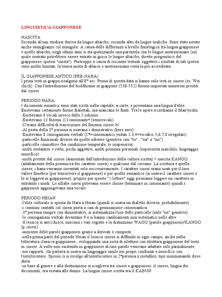 Sono state notate anche somiglianze col mongolo. A causa delle differenze a livello fonologico tra lingua giapponese e quelle altaiche, negli ultimi anni si sta ipotizzando una parentela con le lingue austronesiane (sul quale sostrato potrebbero essere entrate in gioco le lingue altaiche, dirette progenitrici del giapponese ipotesi !mista!". #urtroppo a causa di riscontri testuali oggettivi i risultati di tali ipotesi sono molto limitati, la teoria mista di altaico e austronesiano resta la pi$ accreditata. I% &IA##'N(S( ANTIC' (#)(*NA)A" I primi testi in giappo risalgono all+,- sec. #rima di questa data si hanno solo testi in cinese (es. .ei chich". Con l+introduzione del buddhismo in giappone (/0,*//1" furono importati numerosi prestiti dal cinese. #()I'2' NA)A I documenti rimastici sono stati scritti nella capitale, a corte, e presentano una lingua d+3lite. (sistevano certamente forme dialettali, ma mancano le fonti. Tra le opere ricordiamo il 4an+5oshu. *(sistevano , vocali invece delle / odierne *(sistevano 60 fonemi (66consonanti71semivocali" *C+erano difficolt8 di trascrizione del fonema cinese 9r9 *Al posto della 0- persona si usavano i dimostrativi (:ore sore" *(sistevano , coniugazioni verbali (6-;consonantici 5odan 1,0,<;vocalici /,=,>,, irregolari" *particelle funzionali diverse da quelle odierne (genitivo con !tu! , !na! o !no!" *particelle connettive (ba condizione temporale, te sospensiva" *molti sostantivi e verbi, pochi aggettivi, molti pronomi personali (superiorit8 maschile, linguaggio onorifico" *molti prestiti dal cinese (aumentati dall+introduzione della cultura scritta" ? nascita @AN&' (adattamento della pronuncia dei caratteri cinesi" e qualcuno dal coreano. %a scrittura A quella cinese, i :ana verranno inventati solo successivamente. I caratteri cinesi erano usati per il loro valore fonetico (per trascrivere il giapponese" o per quello semantico (si usava il carattere cinese e lo si leggeva in giapponese" proprio per queste !1 letture! oggi possiamo leggere un carattere in entrambi i modi. %e sillabe cinesi potevano essere chiuse (terminare in consonante" quindi i gapponesi aggiungevano una vocale #()I'2' B(IAN *l+elite culturale si sposta da Nara a Beian (quindi si usava un dialetto diverso, probabilmente" *i continui contatti col cinesi porta a casi di geminazione consonantica *0- persona sempre con dimostrativi, si sistematizza l+uso delle particelle (solo !no! genitivo" *le coniugazioni verbali diventano C e si hanno cambiamenti non sistematici nelle altre *Il lessico si arricchisce, nascono i vari registri e la distinzione .A&' (parole giapponesi"9@AN&' ([Link]" *aumento delle parole giapponesi grazie a derivati e composti *nella prima parte del periodo Beian il lessico cinese si diffonde in ogni campo, anche nella letteratura classica giapponese., sviluppando una sorta di rilettura con struttura giapponese del testo in cinese. A volte non esistendo in giapponese alcune parole venivano adattate solo parzialmente *nei rapporti, chi parlava si usava un linguaggio umile nei propri confronti e onorifico con l+interlocutore. Spesso ci si rivolge all+interlocutore in 1-persona D metafore, tipo menzionando dove abita *in base al genere e alla destinazione si sceglieva tra cinese e giapponese. il cinese, lingua dei documenti, era vietata alle donne. %a lingua cinese scritta era il @AEFN