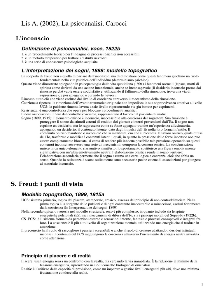 La scoperta di Freud non quella di parlare dellinconscio, ma di dimostrare come questi fenomeni giochino un ruolo fondamentale nella vita psichica dellindividuo (determinismo psichico) . Questo viene dimostrato spiegando in psicopatologia della vita quotidiana (1901) i fenomeni normali (lapsus, motti di spirito) come derivati da una azione intenzionale, anche se inconsapevole (il desiderio inconscio preme dal rimosso perch vuole essere soddisfatto e, utilizzando il fallimento della rimozione, trova una via di espressione); e poi spiegando e curando le nevrosi. Rimosso: tutto ci che viene escluso dal livello di coscienza attraverso il meccanismo della rimozione. Coazione a ripetere: la rimozione dellevento traumatico originale non impedisce la sua sopravvivenza emotiva a livello UCS: la pulsione rimossa lavora a tale livello ripercorrendo vie gia battute per esprimersi. Resistenza: una controforza che opera per bloccare i procedimenti analitici. Libere associazioni: libere dal controllo cosciente, rappresentano il lavoro del paziente di analisi. Sogno (1899, 1915): lelemento onirico inconscio, inaccessibile alla coscienza del sognatore. Sua funzione proteggere il sonno da stimoli esterni (il residuo del giorno) e interni provenienti dallEs. Il sogno non esprime un desiderio, ma lo rappresenta come se fosse appagato tramite unesperienza allucinatoria, appagando un desiderio, il contenuto latente: dato dagli impulsi dellEs nella loro forma infantile. Il contenuto onirico manifesto invece ci che si manifesta, ci che si racconta. Il lavoro onirico, quale difesa dellIo, trasforma e modifica i contenuti latenti i quali, in quanto la pressione delle forze inconsce non pu essere completamente bloccata, si cerca di rendere pi innocua possibile tale pressione operando su questi contenuti inconsci attraverso una serie di meccanismi, compresa la censura onirica. La condensazione unisce in un unico elemento riassuntivo manifesto; lo spostamento sostituisce una figura emotivamente significativa con unaltra emotivamente neutra; lelaborazione plastica rende il sogno veritiero; lelaborazione secondaria permette che il sogno assuma una certa logica e coerenza, cio che abbia un senso. Quando la resistenza scarsa solitamente sono necessarie poche catene di associazioni per giungere al materiale inconscio.