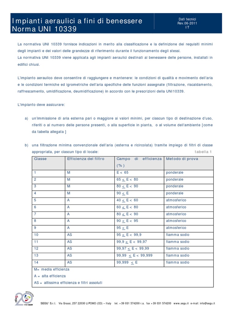 La normativa UNI 10339 fornisce indicazioni in merito alla classificazione e la definizione dei requisiti minimi degli impianti e dei valori delle grandezze di riferimento durante il funzionamento degli stessi. La normativa UNI 10339 viene applicata agli impianti aeraulici destinati al benessere delle persone, installati in edifici chiusi. Limpianto aeraulico deve consentire di raggiungere e mantenere: le condizioni di qualit e movimento dellaria e le condizioni termiche ed igrometriche dellaria specifiche delle funzioni assegnate (filtrazione, riscaldamento, raffrescamento, umidificazione, deumidificazione) in accordo con le prescrizioni della UNI10339. Limpianto deve assicurare: a) unimmissione di aria esterna pari o maggiore ai valori minimi, per ciascun tipo di destinazione duso, riferiti o al numero delle persone presenti, o alla superficie in pianta, o al volume dellambiente [come da tabella allegata ] b) una filtrazione minima convenzionale dellaria (esterna e ricircolata) tramite impiego di filtri di classe appropriata, per ciascun tipo di locale: Classe 1 2 3 4 5 6 7 8 9 10 11 12 13 14 A = alta efficienza AS = altissima efficienza e filtri assoluti Efficienza del filtro M M M M A A A A A AS AS AS AS AS Campo (%) E < 65 65 < E < 80 80 < E < 90 90 < E 40 < E < 60 60 < E < 80 80 < E < 90 90 < E < 95 95 < E 95 < E < 99,9 99,9 < E < 99,97 99,97 < E < 99,99 99,99 < E < 99,999 99,999 < E ponderale ponderale ponderale ponderale atmosferico atmosferico atmosferico atmosferico atmosferico fiamma sodio fiamma sodio fiamma sodio fiamma sodio fiamma sodio di efficienza tabella 1 Metodo di prova
