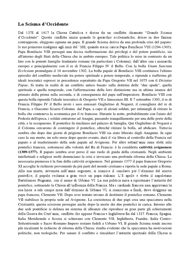 Dal 1378 al 1417 la Chiesa Cattolica divisa da un conflitto chiamato Grande Scisma dOccidente. Questo conflitto inizia quando le gerarchie ecclesiastiche, divise in due fazioni contrapposte, eleggono ognuna un papa. Il grande Scisma deriva da una profonda crisi del papato: le sue premesse risalgono agli inizi del 300, quando era in carica Papa Bonifacio VIII (1294-1303). Papa Bonifacio VIII persegu una decisa riaffermazione dei privilegi e del potere pontificio, sia all'interno degli Stati della Chiesa che in ambito europeo. Tale politica lo mise in contrasto da un lato con le potenti famiglie feudatarie romane (in particolare i Colonna), dallaltro con i monarchi europei e principalmente con il re di Francia Filippo IV il Bello. Con la bolla Unam Sanctam Ecclesiam promulgata il 18 novembre 1302. La bolla papale di Bonifacio VIII costituisce l'ultimo episodio del conflitto medievale tra potere spirituale e potere temporale, e riprende e riafferma gli ideali teocratici espressi in precedenza soprattutto da Papa Gregorio VII nel 1075 con il Dictatus Papae. Si tratta in realt di un conflitto antico basato sulla dottrina delle "due spade", quella spirituale e quella temporale, con l'affermazione della loro distinzione ma in ultima istanza del primato della prima sulla seconda, e di conseguenza del papa sull'imperatore. Bonifacio VIII con questa bolla riprende l'ideale teocratico di Gregorio VII e Innocenzo III. Il 7 settembre 1303, il re di Francia Filippo IV il Bello invi i suoi emissari Guglielmo di Nogaret, il consigliere del re di Francia, e Giacomo Sciarra Colonna dal Papa, a capo di alcuni soldati, per intimargli di ritirare la bolla che conteneva la scomunica per il re francese. Durante la notte, probabilmente con l'aiuto del Podest dell'epoca, i soldati entrarono ad Anagni, passando tranquillamente per una delle porte della citt, e la occuparono. Il pontefice fu rinchiuso nel palazzo di famiglia. Qui Guglielmo di Nogaret e il Colonna cercarono di costringere il pontefice, oltrech ritirare la bolla, ad abdicare. Tuttavia sembra che dopo due giorni di prigione Bonifacio VIII sia stato liberato dagli Anagnini. In ogni caso la sua morte, un solo mese dopo questo evento, dar il via libera al controllo della Francia sul papato e al trasferimento della sede papale ad Avignone. Per oltre settantanni sono eletti solo pontefici francesi, sottomessi alla volont del Re di Francia: la cosiddetta cattivit avignonese (1309-1377). Il papato sembra aver perso il suo ruolo di guida della cristianit. Negli ambienti intellettuali e religiosi molti denunciano la crisi e invocano una profonda riforma della Chiesa. La necessaria premessa la fine della cattivit avignonese. Nel gennaio 1377 il papa francese Gregorio XI accoglie le richieste provenienti da pi parti del mondo cristiano e riporta la sede papale a Roma. Alla sua morte, avvenuta nellanno seguente, si riunisce il conclave per lelezione del nuovo pontefice; il popolo reclama a gran voce un papa italiano. L8 aprile eletto il napoletano Bartolomeo Prignano, con il nome di Urbano VI. La sua politica mira a ripristinare lautorit del pontefice, sottraendo la Chiesa allinfluenza della Francia. Ma i cardinali francesi non approvano la sua linea: a soli cinque mesi dallelezione di Urbano VI, si riuniscono a fondi, dove eleggono un papa francese, Clemente VII. Dopo aver tentato invano di destituire il pontefice romano, Clemente VII stabilisce la propria sede ad Avignone. La coesistenza di due papi crea una spaccatura nella Cristianit: questa scissione prosegue anche dopo la morte dei due pontefici in carica. Intorno alle due sedi pontificie si delinea un sistema di alleanze che riproduce in gran parte gli schieramenti della Guerra dei Centanni, conflitto che oppone Francia e Inghilterra fin dal 1337. Francia, Spagna, Italia Meridionale e Scozia si schierano con Clemente VII; Inghilterra, Fiandre, Italia CentroSettentrionale e Sacro Romano Impero restano fedeli a Urbano VI. Il grande Scisma rende ancora pi incalzanti le richieste di riforma della Chiesa: risulta evidente che la spaccatura ha motivazioni politiche, non teologiche. Per sanare il conflitto e rinsaldare lautorit spirituale della Chiesa si