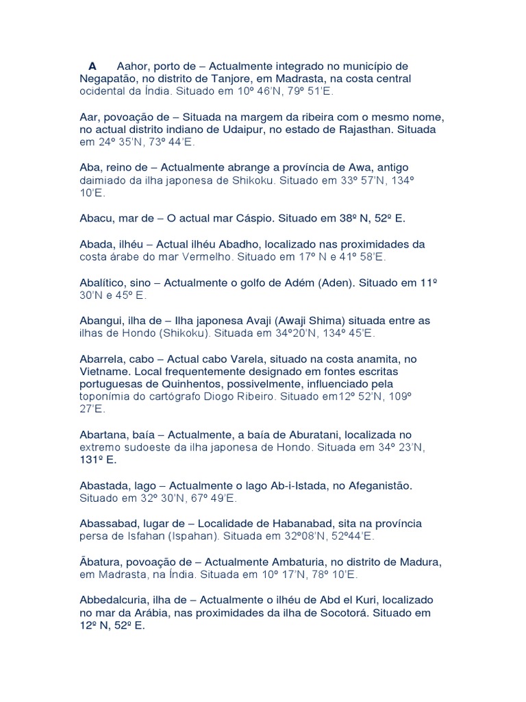 ia. Situado em 10 46N, 79 51E. Aar, povoao de Situada na margem da ribeira com o mesmo nome, no actual distrito indiano de Udaipur, no estado de Rajasthan. Situada em 24 35N, 73 44E. Aba, reino de Actualmente abrange a provncia de Awa, antigo daimiado da ilha japonesa de Shikoku. Situado em 33 57N, 134 10E. Abacu, mar de O actual mar Cspio. Situado em 38 N, 52 E. Abada, ilhu Actual ilhu Abadho, localizado nas proximidades da costa rabe do mar Vermelho. Situado em 17 N e 41 58E. Abaltico, sino Actualmente o golfo de Adm (Aden). Situado em 11 30N e 45 E. Abangui, ilha de Ilha japonesa Avaji (Awaji Shima) situada entre as ilhas de Hondo (Shikoku). Situada em 3420N, 134 45E. Abarrela, cabo Actual cabo Varela, situado na costa anamita, no Vietname. Local frequentemente designado em fontes escritas portuguesas de Quinhentos, possivelmente, influenciado pela toponmia do cartgrafo Diogo Ribeiro. Situado em12 52N, 109 27E. Abartana, baa Actualmente, a baa de Aburatani, localizada no extremo sudoeste da ilha japonesa de Hondo. Situada em 34 23N, 131 E. Abastada, lago Actualmente o lago Ab-i-Istada, no Afeganisto. Situado em 32 30N, 67 49E. Abassabad, lugar de Localidade de Habanabad, sita na provncia persa de Isfahan (Ispahan). Situada em 3208N, 5244E. batura, povoao de Actualmente Ambaturia, no distrito de Madura, em Madrasta, na ndia. Situada em 10 17N, 78 10E. Abbedalcuria, ilha de Actualmente o ilhu de Abd el Kuri, localizado no mar da Arbia, nas proximidades da ilha de Socotor. Situado em 12 N, 52 E.