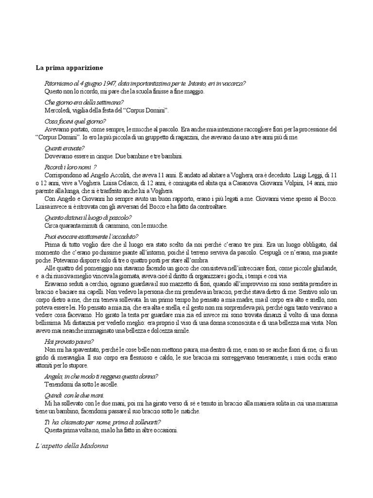 Questo non lo ricordo, mi pare che la scuola finisse a fine maggio. Che giorno era della settimana? Mercoled, vigilia della festa del Corpus Domini. Cosa facevi quel giorno? Avevamo portato, come sempre, le mucche al pascolo. Era anche mia intenzione raccogliere fiori per la processione del Corpus Domini. o ero la pi! piccola di un gruppetto di ragazzini, che avevano da uno a tre anni pi! di me. uanti eravate? Dovevamo essere in cin"ue. Due #am#ine e tre #am#ini. Ricordi i loro nomi ? Corrispondono ad Angelo Accoliti, che aveva $$ anni. % andato ad a#itare a &oghera, ora ' deceduto. (uigi (eggi, di $$ o $) anni, vive a &oghera. (uisa Celasco, di $) anni, ' coniugata ed a#ita "ui a Casanova. *iovanni &olpini, $+ anni, mio parente alla lunga, che si ' trasferito anche lui a &oghera. Con Angelo e *iovanni ho sempre avuto un #uon rapporto, erano i pi! legati a me. *iovanni viene spesso al ,occo. (uisa invece si ' ritrovata con gli avversari del ,occo e ha fatto da controaltare. uanto distava il luogo di pascolo? Circa "uaranta minuti di cammino, con le mucche. !uoi evocare esattamente l"accaduto? -rima di tutto voglio dire che il luogo era stato scelto da noi perch. c/erano tre pini. Era un luogo o##ligato, dal momento che c/erano pochissime piante all/intorno, poich. il terreno serviva da pascolo. Cespugli ce n/erano, ma piante poche. -otevamo disporre solo di tre o "uattro posti per stare all/om#ra. Alle "uattro del pomeriggio noi stavamo facendo un gioco che consisteva nell/intrecciare fiori, come piccole ghirlande, e a chi riusciva meglio vinceva la giornata, aveva cio. il diritto di organizzare i giochi, i tempi e cos via. Eravamo seduti a cerchio, ognuno guardava il suo mazzetto di fiori, "uando all/improvviso mi sono sentita prendere in #raccio e #aciare sui capelli. 0on vedevo la persona che mi prendeva in #raccio, perch. stava dietro di me. 1entivo solo un corpo dietro a me, che mi teneva sollevata. n un primo tempo ho pensato a mia madre, ma il corpo era alto e snello, non poteva essere lei. 2o pensato a mia zia, che era alta e snella, e il gesto non mi sorprendeva pi!, perch. ogni tanto venivano a vedere cosa facevamo. 2o girato la testa per guardare mia zia ed invece mi sono trovata dinanzi il volto di una donna #ellissima. Mi distanziai per vederlo meglio3 era proprio il viso di una donna sconosciuta e di una #ellezza mai vista. 0on avevo mai neanche immaginato una #ellezza e dolcezza simile. #ai provato paura? 0on mi ha spaventato, perch. le cose #elle non mettono paura, ma dentro di me, e non so se anche fuori di me, ci fu un grido di meraviglia. l suo corpo era flessuoso e caldo, le sue #raccia mi sorreggevano teneramente, i miei occhi erano attoniti per lo stupore. $ngela, in che modo ti reggeva questa donna? 4enendomi da sotto le ascelle. uindi con le due mani. Mi ha sollevato con le due mani, poi mi ha girato verso di s. e tenuto in #raccio alla maniera solita in cui una mamma tiene un #am#ino, facendomi passare il suo #raccio sotto le natiche. %i ha chiamato per nome, prima di sollevarti? Questa prima volta no, ma lo ha fatto in altre occasioni. &"aspetto della 'adonna