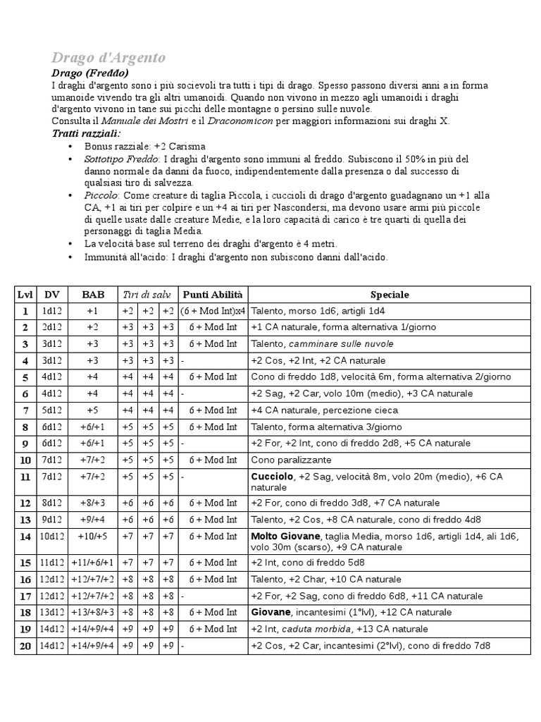 Talenti: =n drago d'argento riceve un talento al (>livello e talenti aggiuntivi al 4>% 8>% (4> e (1> livello. A !a a "#$$i# %S#p&: I draghi d'argento possiedono due tipi di soffio% un cono di freddo o un cono di gas paralizzante. /e creature all'interno di &uest'ultimo devono effettuare con successo un tiro salvezza sulla ?empra o rimanere paralizzate per (d1 round pi ( round per categoria d'et- del drago . '# !a alte nativa %S#p&: Il drago d'argento pu@ assumere una forma alternativa una volta al giorno al > livello% due volte al giorno al "> e tre volte al 8> livello. Il drago pu@ assumere &ualsiasi forma animale o umanoide di taglia ,edia o inferiore come azione standard. Questa capacit- funziona come l'incantesimo metamorfosi lanciato su se stesso al suo normale livello dell'incantatore% tranne per il fatto che il drago non riac&uista punti ferita per il cam!iamento di forma e che pu@ assumere solo forma di un animale o di un umanoide. Il drago pu@ restare nella forma animale o umanoide finchA non decide di assumere una nuova forma o di tornare alla sua forma naturale. (a!!ina e "ulle nuv#le %S#p&: I l drago pu@ posarsi sulle nuvole o sulla ne!!i a come se fosse terreno solido. /a capacit- funzionacostantemente ma pu@ essere negata o ripristinata a volont- . (apacit !a)ic*e: ) partire dal (9> livello un drago d'argento pu@ castare caduta mor!ida due volte al giorno. Il drago casta con un livello di incantatore pari al suo grado di et- 0i draghi fino all'et- di Cucciolo sono incantatori di (> livello% draghi ,olto Biovani sono di > livello e cosC via2. +ncante"i!i:=n drago d'argento lancia incantesimi dai Domini dell')ria% del Bene% della /egge e del Sole come incantesimi arcani. Eedi 'rivilegi comuni dei Dragi per maggiori informazioni.