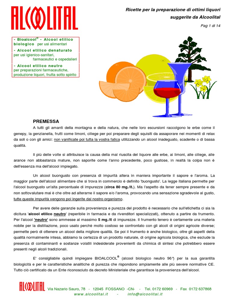 A tutti gli amanti della montagna e della natura, che nelle loro escursioni raccolgono le erbe come il genepy, la genzianella, frutti come limoni, ciliege per poi preparare degli squisiti da assaporare nei momenti di relax da soli o con gli amici: non vanificate poi tutta la vostra fatica utilizzando un alcool inadeguato, scadente o di bassa qualit. Il pi delle volte si attribuisce la causa della mal riuscita del liquore alle erbe, ai limoni, alle ciliege, alle arance non abbastanza mature, non saporite come l'anno precedente, poco gustose, in realt la colpa non dell'essenza ma dell'alcool impiegato. Un alcool buongusto con presenza di impurit altera in maniera importante il sapore e l'aroma. La maggior parte dell'alcool alimentare che si trova in commercio definito 'buongusto'. La legge italiana permette per l'alcool buongusto un'alta percentuale di impurezze (circa 80 mg./lt.). Ma l'aspetto da tener sempre presente e da non sottovalutare mai che oltre ad alterarne il sapore e/o l'aroma, provocando una sensazione sgradevole al gusto, tutte queste impurit vengono poi ingerite dal nostro organismo. Per avere delle garanzie sulla provenienza e purezza del prodotto necessario che sull'etichetta ci sia la dicitura 'alcool etilico neutro' (reperibile in farmacia e da rivenditori specializzati), ottenuto a partire da frumento. Per l'alcool 'neutro' sono ammesse al massimo 5 mg./lt di impurezze. Il frumento tenero certamente una materia nobile per la distillazione, poco usato perch molto costoso se confrontato con gli alcoli di origini agricole diverse; permette per di ottenere un alcool della migliore qualit. Se poi il frumento anche biologico, oltre gli aspetti della qualit normalmente intesa, abbiamo la certezza di un prodotto naturale, di origine agricola biologica, che esclude la presenza di contaminanti e sostanze volatili indesiderate provenienti da chimica di sintesi che potrebbero essere presenti negli alcoli tradizionali. E' consigliabile quindi impiegare BIOALCOOL (alcool biologico neutro 96) per la sua garantita biologicit e per le caratteristiche analitiche di purezza che rispondono ampiamente alle pi severe normative CE. Tutto ci certificato da un Ente riconosciuto da decreto Ministeriale che garantisce la provenienza dell'alcool.