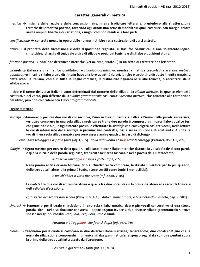 metrica insieme delle regole e delle convenzioni che, in una tradizione letteraria, presiedono alla strutturazione formale del prodotto poetico, fornendo agli autori una serie di modelli sui quali costruire, con margini talora anche ampi di libert e di variazione, i singoli componimenti e le loro parti. versificazione concreta messa in opera delle norme metriche nella costruzione di versi e strofe. ritmo il prodotto della successione e della disposizione regolata, su basi fonico-musicali e non solamente logicosintattiche, di arsi e di tesi, vale a dire di sillabe o posizioni toniche e di sillabe o posizioni atone. funzione poetica adozione di tecniche metriche (verso, rima, strofe ) in un testo di carattere non le tterario. La metrica italiana una metrica qualitativa, o sillabico-accentativa, mentre la metrica greco-latina era una metrica quantitativa in cui le sillabe erano distinte in base alla loro quantit (brevi, lunghe o ancipiti) e disposte in unit metriche dette piedi. In italiano, come in tutte le lingue romanze, la distinzione riguarda le sillabe toniche, o accentate, dalle sillabe atone. Il tipo e il nome del verso italiano sono determinati dal numero delle sillabe. La sillaba metrica, in quanto elemento costitutivo del verso, pu differire dalla sillaba grammaticale cos come laccento metrico, che concorre alla formazione del ritmo, pu non coincidere con laccento grammaticale. Figure metriche sinalefe fenomeno per cui due vocali consecutive, luna in fine di parola e laltra allinizio della parola successiva, vengono comprese in una sola sillaba metrica; se tra le due parole compreso un monosillabo vocalico (es. congiunzione e o o), ugualmente possibile effettuare la sinalefe che coinvolger cos tre vocali; nella lettura le vocali interessate dalla sinalefe si pronunciano contratte, ossia senza soluzione di continuit. A volte le vocali in una sola sillaba metrica possono essere anche quattro, in caso di dittongo. esta selva selvaggia e aspra e forte (Inf. I, v. 5) Colla qual Roma et suoi erranti correggi (Petrarca, RVF LIII, v. 5) dialefe figura metrica per mezzo della quale si collocano in due sillabe metriche distinte la vocale finale di una parola e quella iniziale della parola seguente; frequente nellarea toscana e nella poesia del Quattrocento . esta selva selvaggia e aspra e forte (Inf. I, v. 5) Nella poesia antica di area toscana, fino al Quattrocento compreso, la dialefe si verifica per lo pi quando, delle due vocali, almeno la prima tonica (sono sentiti come tonici i monosillabi): e poi chebber li visi a me eretti (Inf. XXXII, v. 45) La dialefe tra due vocali entrambe atone o quella tra due vocali di cui la prima sia atona e la seconda tonica detta dialefe deccezione: Qual verso Acheronte non si cala (Purg. II, v. 105) Antichissime ombre, e brancolando (Foscolo, Sep. v. 281) sineresi fenomeno per il quale si includono in una sola sillaba metrica due o pi vocali consecutive di una stessa parola, che nella sillabazione consueta appartengono invece a due distinte sillabe grammaticali; si trova spesso nei gruppi vocalici aia, -aio, -oia, -ioia, -iaio e simili. Farinata e l Tegghiaio, che fuor s degni (Inf. VI, v. 79) dieresi fenomeno per il quale si collocano in due diverse sillabe metriche, separandole, due vocali contigue che la normale sillabazione comprende in ununica sillaba grammaticale; spesso segnalata con due puntini sopra la prima delle due vocali interessate dal fenomeno. Cos vido gi temer li fanti (Inf. XXI, v. 94) 1