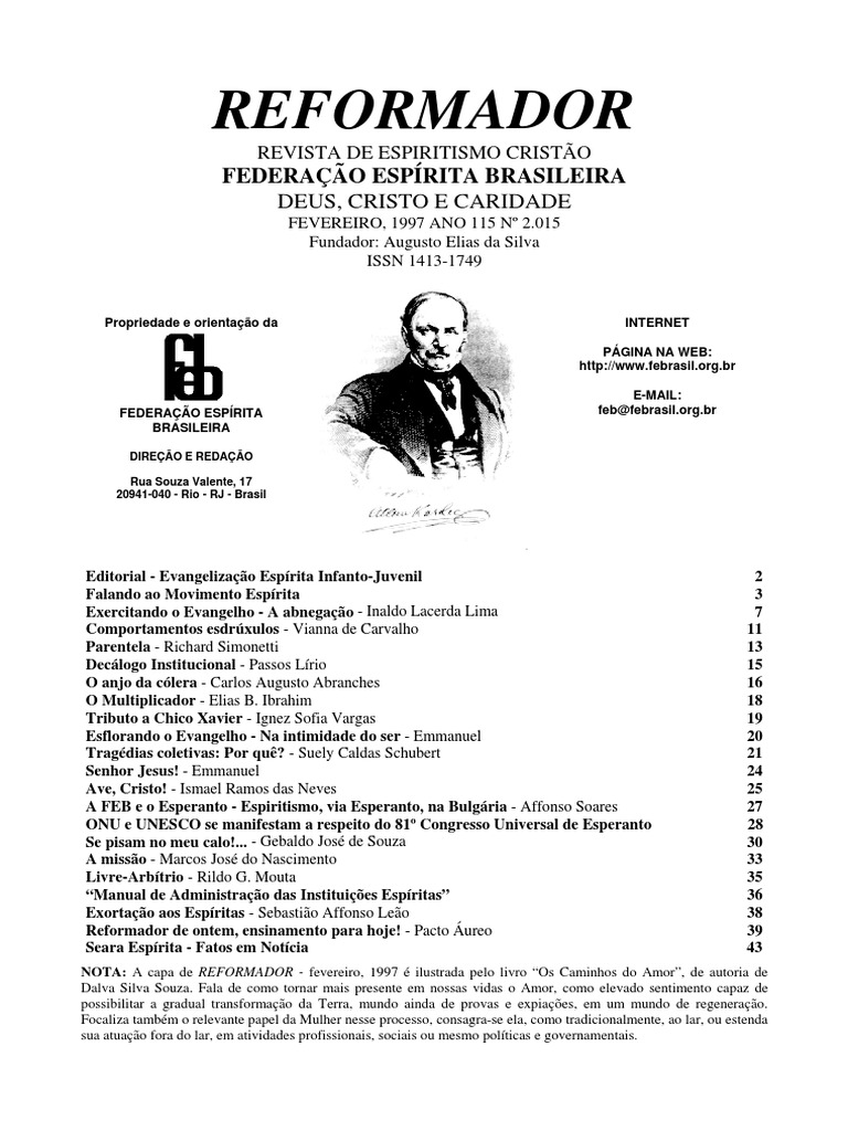 NOTA: A capa de REFORMADOR - fevereiro, 1997 ilustrada pelo livro Os Caminhos do Amor, de autoria de Dalva Silva Souza. Fala de como tornar mais presente em nossas vidas o Amor, como elevado sentimento capaz de possibilitar a gradual transformao da Terra, mundo ainda de provas e expiaes, em um mundo de regenerao. Focaliza tambm o relevante papel da Mulher nesse processo, consagra-se ela, como tradicionalmente, ao lar, ou estenda sua atuao fora do lar, em atividades profissionais, sociais ou mesmo polticas e governamentais.