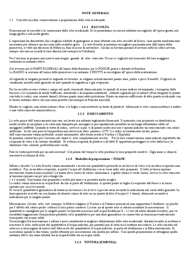 1.1.1 RACCOLTA Premessa per la raccolta la conoscenza delle erbe medicinali. Se la possediamo occorrer soltanto raccoglierle allepoca giusta, nel luogo giusto e nel modo giusto. Lesperienza ha dimostrato che i migliori risultati di guarigione si sono ottenuti con erbe raccolte di resco, cosa !uesta assolutamente necessaria per ottenere un successo nelle malattie gravi. Le erbe resche si possono raccogliere personalmente dallinizio della primavera, a volte sin dal mese di ebbra io, ino al mese di novembre. "lcune si trovano persino dinverno sotto la coltre nevosa, sempre che uno ne ricordi la loro dimora #ad esempio la Celidonia$. Per linverno si prepara una riserva non troppo grande di erbe essiccate. %ccor re coglierle nel momento del loro maggiore contenuto in sostanze attive. Ci& avviene per le P"'() *L%'+"L) allinizio della ioritura, per le *%,L)+ prima e durante la ioritura. Le '"-)C) si scavano allinizio della primavera o in autunno. ) *'.(() si raccolgono allepoca della maturazione. "l riguardo si tengano presenti le seguenti avvertenze: si colgano esclusivamente piante sane, pulite e prive dinsetti/ Coglierle in condizioni asciutte nelle giornate di sole !uando la rugiada ne gi evaporata. Per la raccolta occorre evitare i campi ed i prati concimati chimicamente, le sponde di ac!ue sudicie ed in!uinate, i terrapieni delle errovie e la vicinanza di strade tra icate, autostrade e di impianti industriali. "bbiate riguardo per la natura/ #0on strappate le piante con tutte le radici, non causate danni/$ "lcune piante sono sotto protezione. +siste un numero su iciente di altre piante medicinali con le stesse sostanze attive che non sono protette #ad esempio la Primula auricola$. 1entre le cogliete, non schiacciatene i iori e le oglie e non mettetele in buste di plastica/ "ltrimenti le erbe comincerebbero a sudare e una volta essiccate annerirebberco. 1.1.2 ESSICCAMENTO Le erbe prima dellessiccamento non van2 no lavate ma soltanto tagliuzzate inemente. )l materiale cos3 preparato va distribuito in modo sciolto su un panno o su carta non stampata per asciugare il pi4 rapidamente possibile in un luogo abbastanza caldo ed arieggiato #so itta$. 5uando si tratta di radici, cortecce o par2 ti di piante molto succose spesso indicato un essiccamento con calore arti iciale. )n tal caso per& la temperatura non dovr mai oltre2 passare i 678C. Le radici accuratamente lavate, prima dellessiccamento vanno pre eribil2 mente sminuzzate9 allo stesso modo il :ischio e l+pilobio. Si possono conservare per linverno sol2 tanto le erbe completamente secche. Per la loro conservazione sono indicati soprattutto dei recipienti di vetro o di cartone chiudibili. Si evitino recipienti di plastica o di latta/ ; opportuno proteggere le erbe dalla luce #si utilizzino vetri colorati, pre eribilmente verdi$. *ate la vostra provvista per un solo inverno/ Col passar del tempo le erbe perdono le loro propriet curative. %gni anno ci dona la sua nuova ricchezza di erbe. 1.1.3 Modalit di preparazione TISANE )n uso e decotto: Le erbe resche vanno sminuzzate e messe nei !uantitativi prescritti in un bricco di vetro o in un altro recipiente non metallico. Poi, in un altro recipiente, si porta lac!ua allebollizione e la si versa sulle erbe preparate. )l tutto si lascia riposare brevemente #basta mezzo minuto$/ La tisana deve essere di colore chiarissimo: o giallo chiaro o verde chiaro. )nvece le erbe essiccate si lasciano riposare un po pi4 a lungo #da 1 a < minuti$. .na tisana cos3 preparata molto pi4 sana e si presenta anche meglio. Le radici vanno immerse in ac!ua red2 da che si porta allebollizione. " !uesto punto si toglie il recipiente dal uoco e si lascia riposare per circa tre minuti. Si versa il !uantitativo giornaliero di tisana in un termos e lo si beve a piccoli sorsi secondo le indicazioni nel corso della giornata. )n linea generale si mette un cucchiaino da dessert colmo di erbe su un !uarto di litro dac!ua #= 1 tazza$, altrimenti secondo le indicazioni per le singole piante. 1acerazione: "lcune erbe #ad esempio la 1alva vulgaris, il :ischio e il Calamo aromatico$ non sopportano lebollizio2 ne poich per le etto del calore perde2 rebbero il loro potere curativo. La tisa2 na di !ueste erbe si ottiene mediante la macerazione. )l !uantitativo consigliato per le singole piante va lasciato macerare nellac!ua redda per > 2 1< ore #di solito durante la notte$, poi va riscaldato leggermente #temperatura potabile$ ed il !uantitativo per una dose giornaliera va conservato in termos preventivamente sciac!uato con ac!ua calda. .n miscuglio ra macerazione e in uso per& considerato la migliore utilizzazione delle erbe medicinali: durante la notte si mettono a macerare le erbe, nella met del !uantitativo dac!ua indicato, per passarle poi al setaccio il mattino successivo. Le erbe rimaste nel setaccio si immergono di nuovo nellaltra met del !uantitativo dac!ua indicato, si porta ad ebollizione e si iltra nuovamente. Si mescolano !uindi le due tisane, !uella ottenuta per macerazione con !uella per in uso. Con !uesta preparazione si ottengono !uelle sostanze attive che sono solubili sia in ac!ua redda che in ac!ua calda. 1.1.4 TINT RA !ESSEN"A#