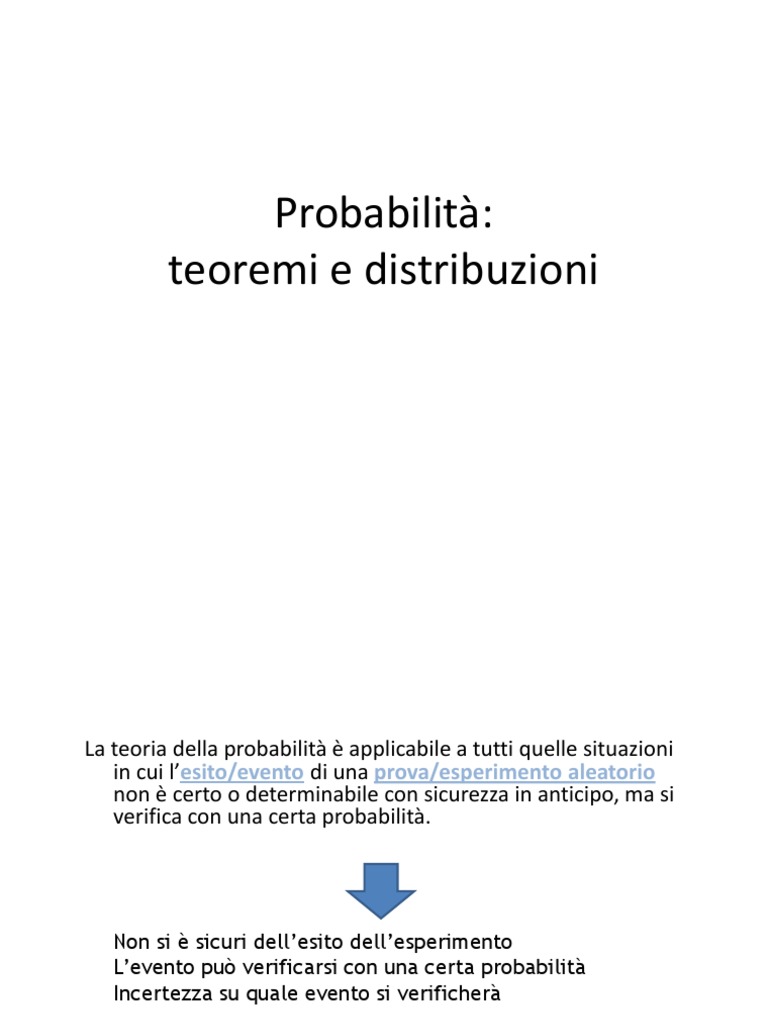 La teoria della probabilit applicabile a tutti quelle situazioni in cui lesito/evento di una prova/esperimento aleatorio non certo o determinabile con sicurezza in anticipo, ma si verifica con una certa probabilit.