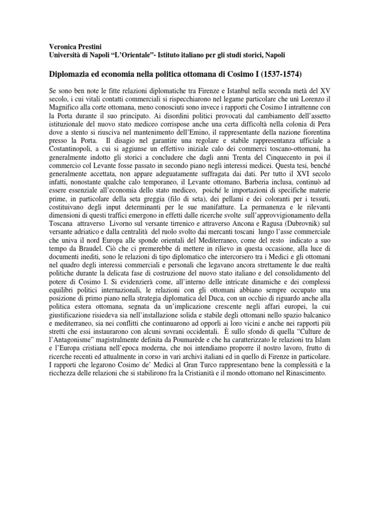 The diplomatic and commercial relations between the Florentine rulers and the Ottoman Empire dated back to the time of Sultan Mehmed II (1451-1481), who invited the Florentine merchants and granted them trade privileges as a part of his policy of reviving and rebuilding Constantinople as his new capital after the conquest. The exact date of the first formal ahidname granted to the Florentines by Mehmed II is not known as the document is missing. However, this ahidname was subsequently renewed by Bayezid II (1488, 1499), Selim I (1513) and Sleyman I (1527). Florentine merchants were quite dominant in the silk and wool trade traffic in the first half of the sixteenth century and they established several commercial companies in Pera (Istanbul), Bursa and Adrianople. However, according to the dominant view in the historiography, the Florentines soon lost interest in the Levant trade and from 1520s onward turned their face to the new routes westwards and developed connections more with the Spanish merchants. On the other hand, the two diplomatic attempts by the Florentines to the Ottoman court in the second half of the sixteenth century seem to confute this argument. This paper focuses on these two diplomatic attempts by the Medicis for commercial privileges in the Ottoman lands. One of these was between 1574-1578 during the rule of Grand Duke Francesco I deMedici and the other one was in 1598-1599 during the time of Grand Duke Ferdinando I deMedici, brother of Francesco I. Both attempts, though started successfully, ended in failure for different reasons and due to various factors. Still, these attempts show that the Medici rulers were quite interested in the Eastern Mediterranean trade zone and they developed their diplomatic and political strategies accordingly to get a share from the Levant trade. By asking the question What went wrong? the paper aims to concentrate not only on the negotiation process itself but also on the interplay of various factors and groups (such as Venetians and French) in the failure of the negotiations. The main sources of this paper will be the letters and treaties exchanged between the Florentines and the Ottomans, preserved in the Mediceo del Principato filza 4274 and 4275. These will be also complemented by some Venetian and European sources. In the light of these sources, the paper intends to unfold the different connections and networks in the individual level between the Florentine agents and the Ottoman administrators and the role of the middlemen in the negotiations. Moreover, through reading between the lines in these letters, the paper will try to give an insight into the Florentine perceptions of the Ottomans and vice versa. The Florentines and their relations with the Ottoman Empire in the sixteenth century is one of the least investigated subjects. Apart from a few articles with limited focus, there is no study handling this topic. Thus, instead of presenting a traditional narrative of unsuccessful diplomatic relations between the two states, this paper intends to go beyond and provide a different perspective by analyzing network relations and perceptions.