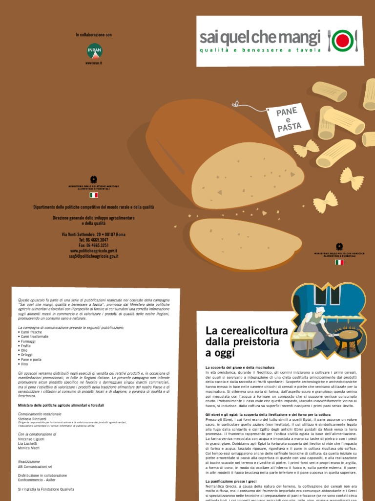 Questo opuscolo fa parte di una serie di pubblicazioni realizzate nel contesto della campagna Sai quel che mangi, qualit e benessere a tavola, promossa dal Ministero delle politiche agricole alimentari e forestali con il proposito di fornire ai consumatori una corretta informazione sugli alimenti messi in commercio e di valorizzare i prodotti di qualit delle nostre Regioni, promuovendo un consumo sano e naturale. La campagna di comunicazione prevede le seguenti pubblicazioni: Carni fresche Carni trasformate Formaggi Frutta Olio Ortaggi Pane e pasta Vino Gli opuscoli verranno distribuiti negli esercizi di vendita dei relativi prodotti e, in occasione di manifestazioni promozionali, in tutte le Regioni italiane. La presente campagna non intende promuovere alcun prodotto specifico n favorire o danneggiare singoli marchi commerciali, ma si pone lobiettivo di valorizzare i prodotti della tradizione alimentare del nostro Paese e di sensibilizzare i cittadini al consumo di prodotti locali e di stagione, a garanzia di qualit e di freschezza. Ministero delle politiche agricole alimentari e forestali Coordinamento redazionale Stefania Ricciardi