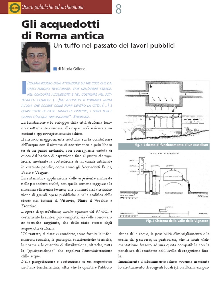 di Nicola Grifone ROMANI POSERO OGNI ATTENZIONE SU TRE COSE CHE DAI GRECI FURONO TRASCURATE, CIO NELLAPRIRE STRADE, NEL CONDURRE ACQUEDOTTI E NEL COSTRUIRE NEL SOTTOSUOLO CLOACHE ()GLI ACQUEDOTTI PORTANO TANTA ACQUA CHE SCORRE COME FIUMI DENTRO LA CITT () E QUASI TUTTE LE CASE HANNO LE CISTERNE, I LORO TUBI E CANALI DACQUA ABBONDANTE. STRABONE. La fondazione e lo sviluppo della citt di Roma furono strettamente connessi alla capacit di assicurare un costante approvvigionamento idrico. Il metodo maggiormente adottato era la conduzione dellacqua con il sistema di scorrimento a pelo libero su di un piano inclinato, con conseguente caduta di quota dal bacino di captazione fino al punto derogazione, mediante la costruzione di un canale artificiale in costante pendio, come sono gli Acquedotti Felice, Paolo e Vergine. La sistematica applicazione delle esperienze maturate nelle precedenti civilt, con quella romana raggiunse la massima efficienza tecnica, che culmin nella realizzazione di grandi opere pubbliche e nella codifica delle stesse nei trattati di Vitruvio, Plinio il Vecchio e Frontino. Lopera di questultimo, curator aquarum del 97 d.C., certamente la sintesi pi completa, sia delle conoscenze tecniche raggiunte, che dello stato stesso degli acquedotti di Roma. Nel trattato, di ciascun condotto, sono fornite le informazioni storiche, le principali caratteristiche tecniche, le norme e le quantit di distribuzione; oltrech, tutta la giurisprudenza che regolava lamministrazione delle acque. Nella progettazione e costruzione di un acquedotto risultava fondamentale, oltre che la qualit e labbon-