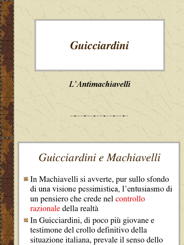 In Machiavelli si avverte, pur sullo sfondo di una visione pessimistica, lentusiasmo di un pensiero che crede nel controllo razionale della realt In Guicciardini, di poco pi giovane e testimone del crollo definitivo della situazione italiana, prevale il senso dello scacco, dellimpossibilit di dominare gli eventi.