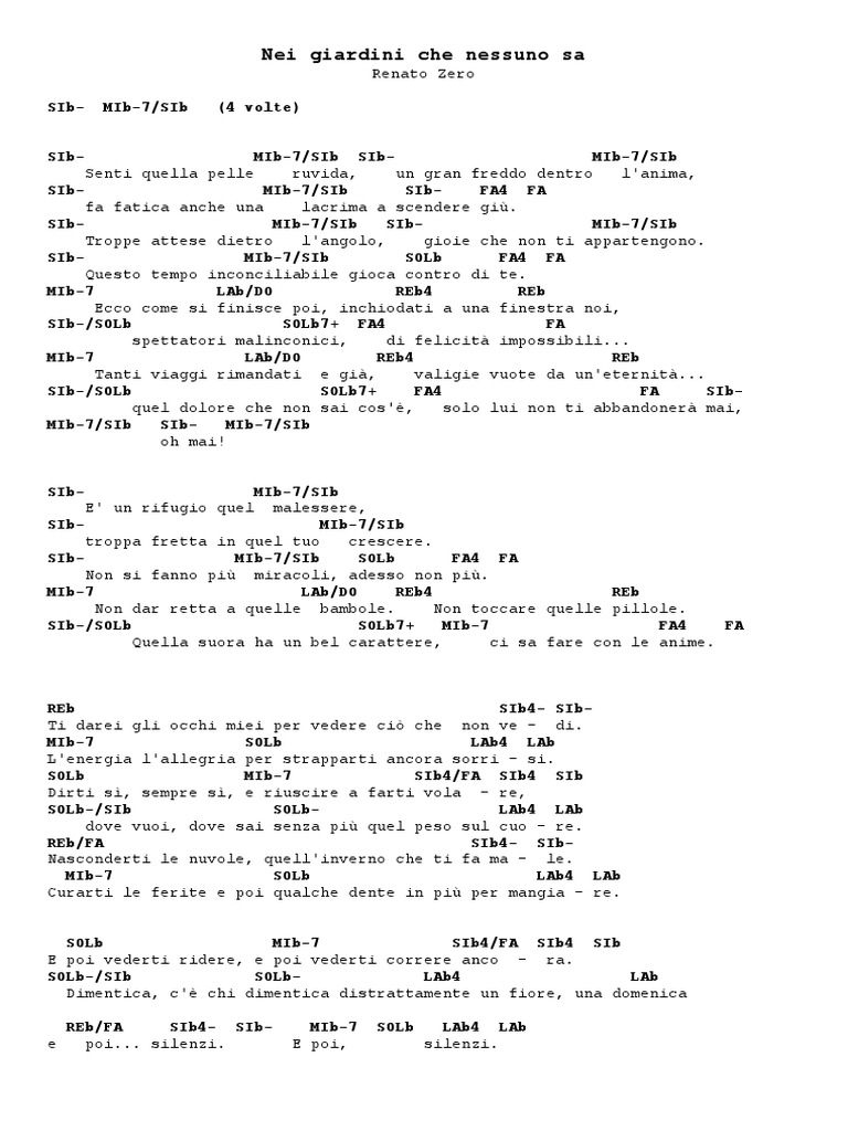 MIb-7/SIb #ei giardini che nessuno sa SIbMIb-7/SIb si respira l'inutilit , SIbMIb-7/SIb SOLb FA4 FA c'! rispetto grande puli)ia, ! quasi follia. MIb-7 LAb/ O #on sai come ! bello stringerti, !"b4 !"b ritrovarsi qui a difenderti, SIb-/SOLb SOLb7# FA4 FA e vestirti e pettinarti s(, e sussurrarti non arrenderti. MIb-7 LAb/ O !"b4 !"b #ei giardini che nessuno sa quanta vita si trascina qua, SIb-/SOLb SOLb7# solo acciacchi, piccole anemie. MIb-7 FA4 FA Siamo niente sen)a fantasie. !"b SIb4- SIbSorreggili, aiutali, ti prego non lasciarli cade % re. MIb-7 SOLb LAb4 LAb Esili, fragili, non negargli un po' del tuo amo % re. SOLb MIb-7 SIb4/FA SIb4 SIb Stelle che ora tacciono, ma daranno un senso a quel cie % lo. SOLb-/SIb SOLbLAb4 LAb +li uomini non brillano, se non sono stelle anche lo % ro. !"b/FA SIb4- SIb,ani che ora tremano, perch- il vento soffia pi for % te... MIb-7 SOLb LAb4 LAb #on lasciarli adesso no, che non li sorprenda la mor% te. SOLb MIb-7 SIb4/FA SIb4 SIb Siamo noi gli inabili, che pure avendo a volte non dia % mo. SOLb-/SIb SOLbLAb4 LAb 'imentica, c'! chi dimentica distrattamente un fiore, una domenica !"b/FA SIb4- SIbe poi... silen)i. MIb-7 SOLb LAb4 LAb E poi, silen)i. !"b/FA SOLb SIb-% MIb-7 SIbSIb4/FA MIb-7 SIb4 SOLb SIb LAb4 LAb SOLbLAb4 LAb SOLb-