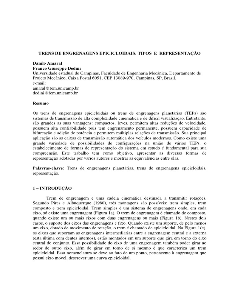Máquinas de Levantamento, Rio de Janeiro, 230 p., 1988 ., Syntesis of Kinematic Structure of Geared Kinematic Chains and other Mechanisms, , v. 5, p. 357-392, 1970. Computer-Aided Sketching of Epicyclic-Type Automatic Transmission Gear Trains, , paper TR 95-92, 7 p., 1995. Projeto e Otimização de uma Transmissão Planetária por Rolos de Tração, UNICAMP, 150 p. , 1985. Manual Del Constructor de Maquinas, 2ª Edição, Editorial Labor S.ª, Barcelona, Madri, 1951 p., 1944 Enumeration and Selection of Clutching Sequences Associate with Epicyclic- Type Transmission Mechanisms, Tese (Doutorado), 212 p., 1997 A Graph Representation for the Structural Synthesis of Geared Kinematic Chains, v. 330, nº. 1, p. 131-143, janeiro 1993. ., A New Graph Representation for the Automatic Kinematic Analysis of Planetary Spur-Gear Trains, , v. 114, p. 196-200, 1992. Structure and Analysis of Planetary Gear Trains, , v. 3, p. 131-148, 1968 ., Trem de Engrenagens Planetários: Análise, Síntese e Aplicação em Veículo Híbrido, , Faculdade de Engenharia Mecânica da UNICAMP, 1980. Power Flow and Loss in Differential Mechanisms , v. 3, n. 37, p. 45-53, 1961 A New Graph Theory Representation for the Topological Analysis of Planetary Gear Trains, , v. 3, p. 1421-1425, 1987. Elementos de Máquinas, Editora Guanabara Dois S. A. , Rio de Janeiro, 440 p., 1980 ., Syntesis of Multiple-Speed Transmissions of the Planetary – Gear Type, , v. 14, p. 93-101, 1972 Elementos de Máquinas, Livros Técnicos e Científicos Editora S. A, Rio de Janeiro, 700 p., 1984. The Creation of True Two-Degree-of-Freedom Epicyclic Gear Trains, , paper TR 88-21, 1988 Graphs – An Introductory Approach, , 340 p., 1990.