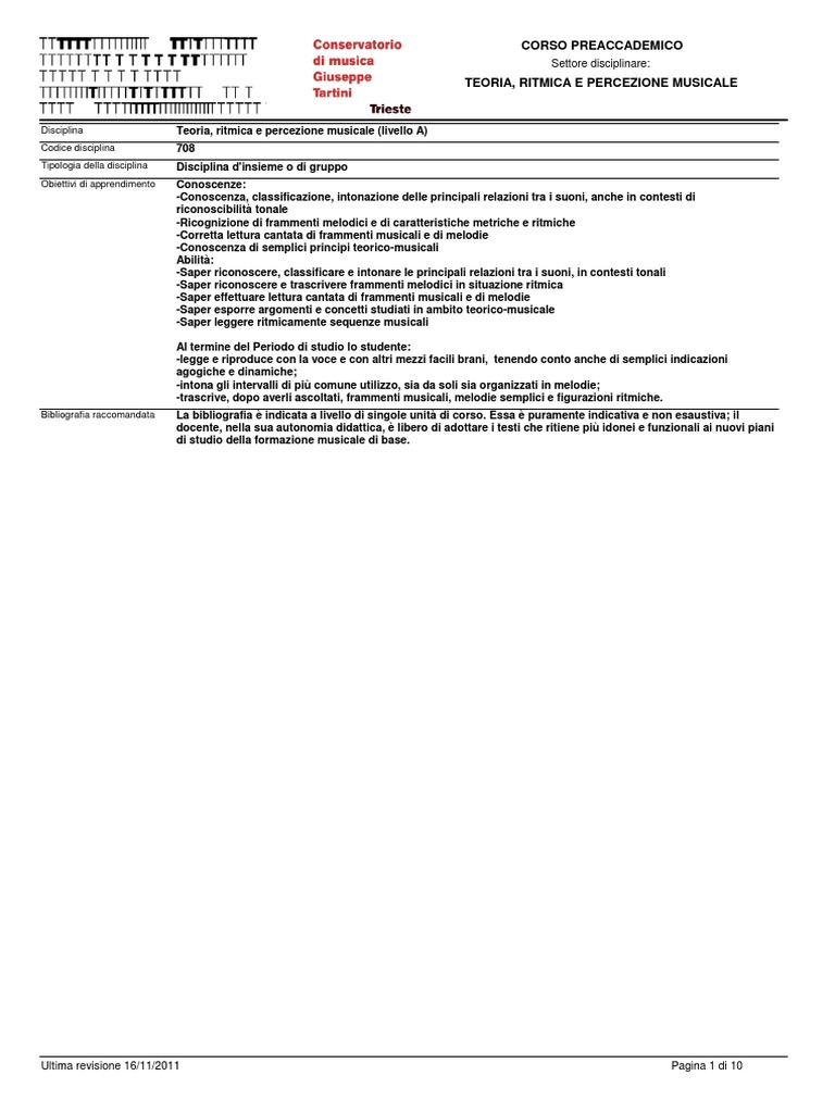 TEORIA, RITMICA E PERCEZIONE MUSICALE (LIVELLO A.1) COTP/06PA1 Disciplina d'insieme o di gruppo Italiano Annuale LETTURA MELODICA - individuale: esecuzione vocale di una melodia nel modo maggiore e minore (fino a una/due alterazioni in chiave), con note della tonalit dimpianto e alterazioni transitorie proprie delle scale minori utilizzate; - collettiva: esecuzione vocale di brevi e semplici esercizi a 2 voci, in stile armonico (bicordi) e/o polifonico (elementari strutture contrappuntistiche, a parti alternate, imitazioni, canoni), con note della tonalit dimpianto. TRASPORTO Esecuzione vocale di semplici frammenti melodici (5-7 suoni ad intervalli in prevalenza congiunti), con trasporto ad un tono sopra/sotto rispetto alla configurazione scritta. LETTURA RITMICA Esecuzione di una lettura: - parlata (tradizionale) in chiave di violino e di basso, nei tempi semplici e composti pi comuni, con figurazioni ritmiche di difficolt contenuta, compresi i gruppi irregolari con terzine, doppie terzine e sestine; - ritmica (a una parte), sillabata o percussiva, nei tempi semplici e composti pi comuni, con figurazioni ritmiche pi complesse rispetto alla precedente; - poliritmica (a due parti) individuale e/o collettiva, sillabata o percussiva, con figurazioni analoghe alla precedente. DETTATO Trascrizione di: - un dettato ritmico nei tempi semplici fondamentali, con figurazioni ritmiche di difficolt contenuta; - un dettato melodico con frammenti di 5-7 suoni nelle tonalit maggiori fino ad una alterazione in chiave (senza indicazione di tempo ritmico); - un dettato musicale (ritmico-melodico) nelle tonalit maggiori fino a una alterazione in chiave, nei tempi semplici fondamentali e con prevalenza di intervalli congiunti. TEORIA MUSICALE Elementi fondamentali di notazione, ortografia e teoria musicale; concetto di scala; gradi della scala; scale maggiori e individuazione delle relative minori COMPOSIZIONE E IMPROVVISAZIONE - completamento estemporaneo di un breve frammento musicale proposto, con lutilizzo coerente degli elementi ritmico-melodici; - variazione estemporanea del frammento proposto, con modificazione degli elementi ritmico-melodici; ASCOLTO Discriminazione e identificazione di: altezza del suono (in una sequenza di vari suoni); suono ricorrente (in una sequenza di vari suoni); diversit o uguaglianza tra incisi ritmico-melodici; modo maggiore/minore tra due accordi; modo maggiore/minore tra frammenti melodici; altre prove a discrezione del docente, finalizzate alleducazione dellorecchio musicale e adeguate al livello medio del gruppo. LETTURA MELODICA Lettura cantata individuale a prima vista di una melodia in chiave di violino (come descritto) LETTURA RITMICA Lettura parlata a prima vista in biclavio (chiavi di violino e basso; come descritto). Lettura ritmica, a prima vista, di una sequenza a una parte (come descritto). DETTATO Dettato ritmico, melodico e musicale (come descritti), con grado di difficolt adeguato al programma svolto. TEORIA MUSICALE Questionario o colloquio sugli argomenti di teoria musicale descritti.