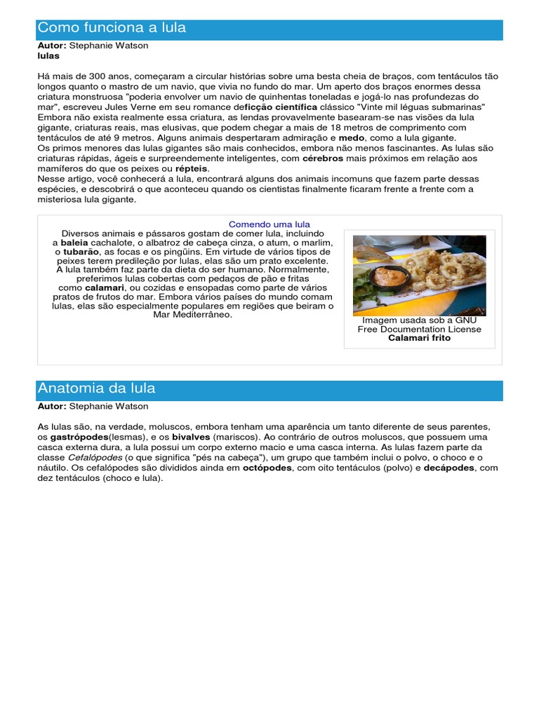 Há mais de 300 anos, começaram a circular histórias sobre uma besta cheia de braços, com tentáculos tão longos quanto o mastro de um navio, que vivia no fundo do mar. Um aperto dos braços enormes dessa criatura monstruosa "poderia envolver um navio de quinhentas toneladas e jogá-lo nas profundezas do mar", escreveu Jules Verne em seu romance deficção científica clássico "Vinte mil léguas submarinas" Embora não exista realmente essa criatura, as lendas provavelmente basearam-se nas visões da lula gigante, criaturas reais, mas elusivas, que podem chegar a mais de 18 metros de comprimento com tentáculos de até 9 metros. Alguns animais despertaram admiração e medo, como a lula gigante. Os primos menores das lulas gigantes são mais conhecidos, embora não menos fascinantes. As lulas são criaturas rápidas, ágeis e surpreendemente inteligentes, com cérebros mais próximos em relação aos mamíferos do que os peixes ou répteis. Nesse artigo, você conhecerá a lula, encontrará alguns dos animais incomuns que fazem parte dessas espécies, e descobrirá o que aconteceu quando os cientistas finalmente ficaram frente a frente com a misteriosa lula gigante.