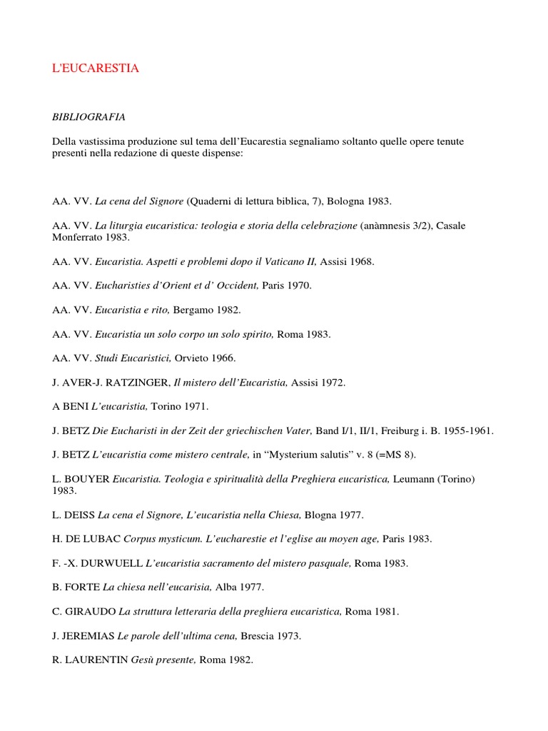 Della vastissima produzione sul tema dellEucarestia segnaliamo soltanto quelle opere tenute