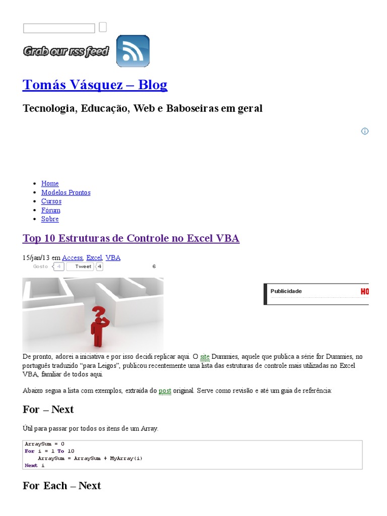De pronto, adorei a iniciativa e por isso decidi replicar aqui. O site Dummies, aquele que publica a série for Dummies, no português traduzido “para Leigos”, publicou recentemente uma lista das estruturas de controle mais utilizadas no Excel VBA, familiar de todos aqui.