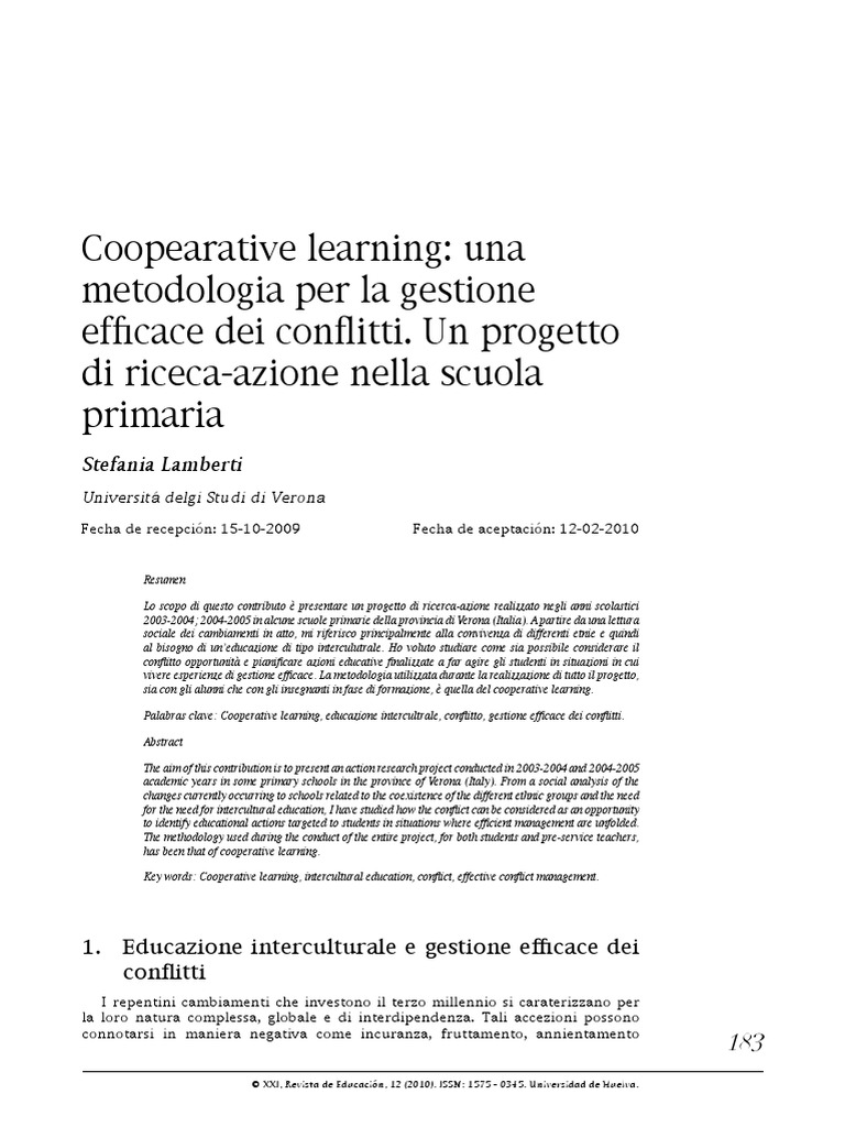 Palabras clave: Cooperative learning, educazione intercultrale, confitto, gestione effcace dei confitti.