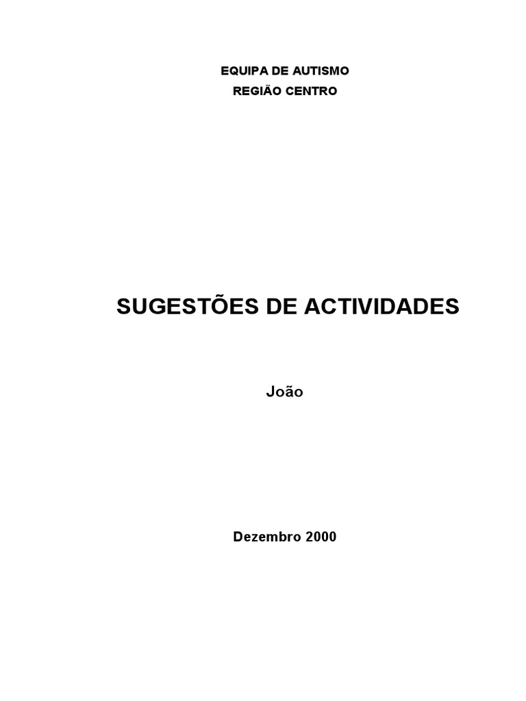 No dia 18 de Novembro de 2000 realizámos a avaliação do António João Domingues D. Silva com 9 A e 3 M, tendo por base o PEP-R (Perfil Psicoeducacional Revisto, de Schopler e Reichler). Pelos resultados desta avaliação vemos que o nível de desenvolvimento funcional do João se situa entre os, mas com possibilidades de evoluir para um nível superior, e que apresenta como áreas mais fortes a Motricidade, a Imitação e a Percepção. De acordo com o nível de desenvolvimento funcional em cada área e partindo dos comportamentos emergentes do João, a Equipa de Avaliação elaborou uma sequência de actividades que poderão servir de suporte para a elaboração do seu Programa Individual. Assim, este bloco de “Sugestões de Actividades” deverá ser lido e discutido pela Família e Técnicos intervenientes no processo educativo para que, posteriormente e em reunião com Equipa de Avaliação, se seleccionem as actividades a desenvolver. Qualquer uma destas actividades tem objectivos bem explícitos e o procedimento relatado é um exemplo de como desenvolvê-las podendo servir de suporte para muitas outras que Técnicos e Pais poderão recriar. Possivelmente, o João já é capaz de realizar sozinho algumas das actividades sugeridas, que poderão servir de proposta para ela as realizar no gabinete individual. Propomos que em cada área se seleccione uma actividade para ser ensinada em situação 1:1 e que só depois de bem consolidada se deverá passar a outra.