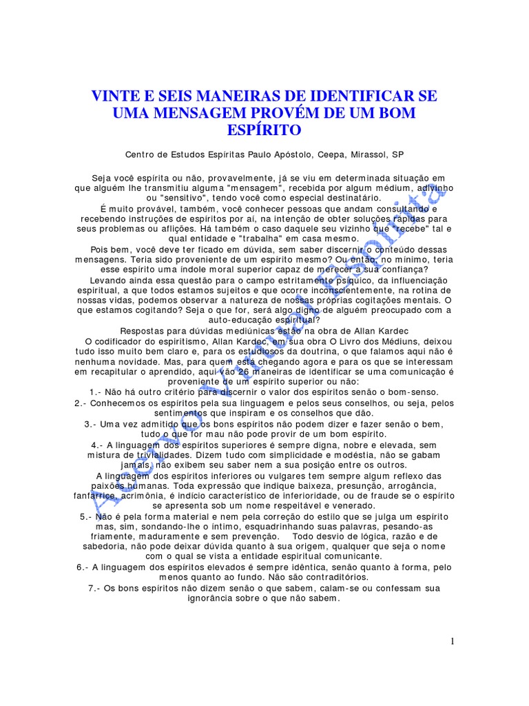 Seja voc esprita ou no, provavelmente, j se viu em determinada situao em que algum lhe transmitiu alguma "mensagem", recebida por algum mdium, adivinho ou "sensitivo", tendo voc como especial destinatrio. muito provvel, tambm, voc conhecer pessoas que andam consultando e recebendo instrues de espritos por a, na inteno de obter solues rpidas para seus problemas ou aflies. H tambm o caso daquele seu vizinho que "recebe" tal e qual entidade e "trabalha" em casa mesmo. Pois bem, voc deve ter ficado em dvida, sem saber discernir o contedo dessas mensagens. Teria sido proveniente de um esprito mesmo? Ou ento, no mnimo, teria esse esprito uma ndole moral superior capaz de merecer a sua confiana? Levando ainda essa questo para o campo estritamente psquico, da influenciao espiritual, a que todos estamos sujeitos e que ocorre inconscientemente, na rotina de nossas vidas, podemos observar a natureza de nossas prprias cogitaes mentais. O que estamos cogitando? Seja o que for, ser algo digno de algum preocupado com a auto-educao espiritual? Respostas para dvidas medinicas esto na obra de Allan Kardec O codificador do espiritismo, Allan Kardec, em sua obra O Livro dos Mdiuns, deixou tudo isso muito bem claro e, para os estudiosos da doutrina, o que falamos aqui no nenhuma novidade. Mas, para quem est chegando agora e para os que se interessam em recapitular o aprendido, aqui vo 26 maneiras de identificar se uma comunicao proveniente de um esprito superior ou no: 1.- No h outro critrio para discernir o valor dos espritos seno o bom-senso. 2.- Conhecemos os espritos pela sua linguagem e pelos seus conselhos, ou seja, pelos sentimentos que inspiram e os conselhos que do. 3.- Uma vez admitido que os bons espritos no podem dizer e fazer seno o bem, tudo o que for mau no pode provir de um bom esprito. 4.- A linguagem dos espritos superiores sempre digna, nobre e elevada, sem mistura de trivialidades. Dizem tudo com simplicidade e modstia, no se gabam jamais, no exibem seu saber nem a sua posio entre os outros. A linguagem dos espritos inferiores ou vulgares tem sempre algum reflexo das paixes humanas. Toda expresso que indique baixeza, presuno, arrogncia, fanfarrice, acrimnia, indcio caracterstico de inferioridade, ou de fraude se o esprito se apresenta sob um nome respeitvel e venerado. 5.- No pela forma material e nem pela correo do estilo que se julga um esprito mas, sim, sondando-lhe o ntimo, esquadrinhando suas palavras, pesando-as friamente, maduramente e sem preveno. Todo desvio de lgica, razo e de sabedoria, no pode deixar dvida quanto sua origem, qualquer que seja o nome com o qual se vista a entidade espiritual comunicante. 6.- A linguagem dos espritos elevados sempre idntica, seno quanto forma, pelo menos quanto ao fundo. No so contraditrios. 7.- Os bons espritos no dizem seno o que sabem, calam-se ou confessam sua ignorncia sobre o que no sabem.