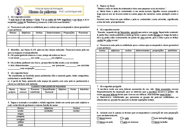 a) Transcreve cada palavra sublinhada para a coluna que corresponde classe gramatical