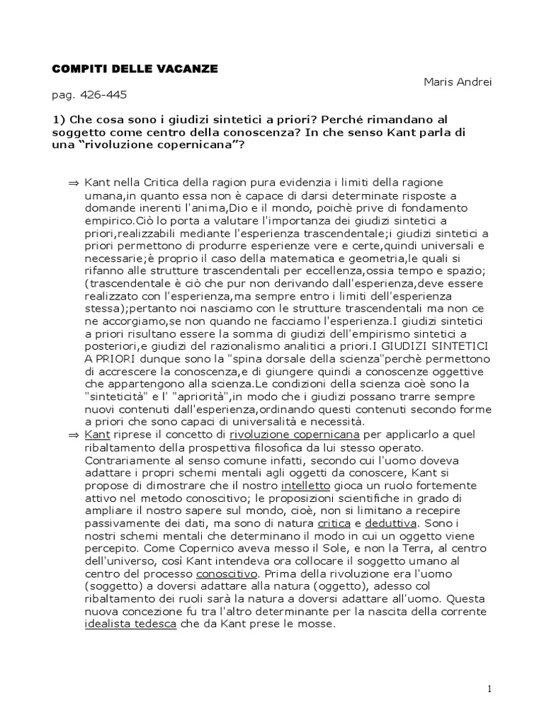 1) Che cosa sono i giudizi sintetici a priori? Perch rimandano al