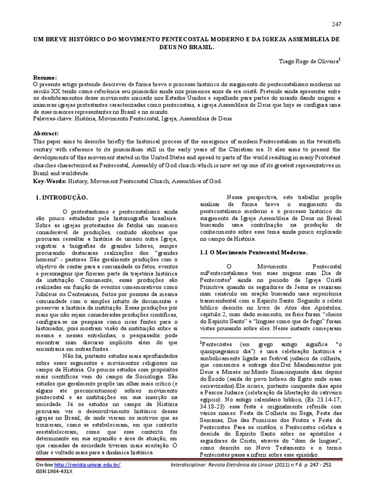 pentecostalismo no Brasil. Petrpolis, RJ: Vozes, 1996.