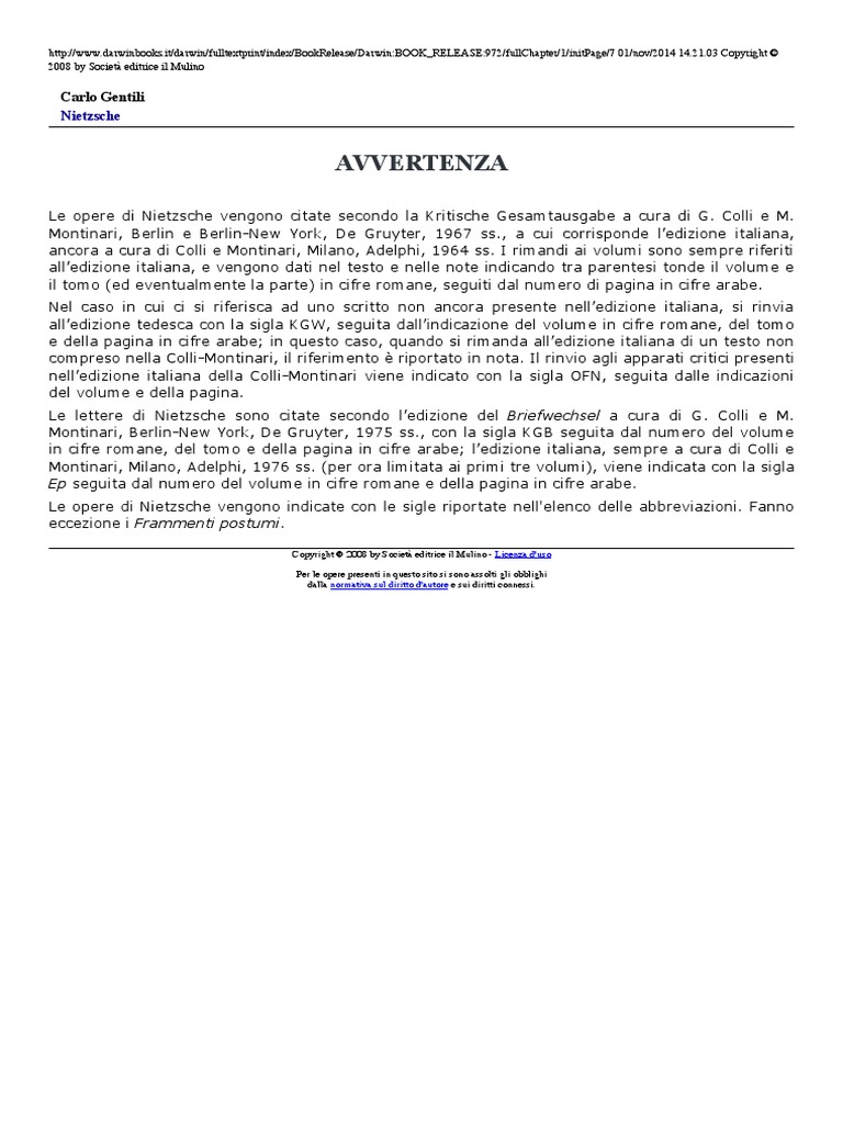 Le opere di Nietzsche vengono citate secondo la Kritische Gesamtausgabe a cura di G. Colli e M.