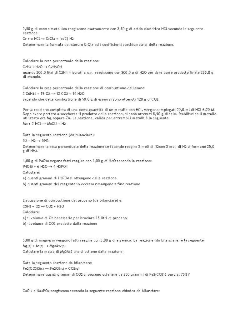 Calcolare la resa percentuale della reazione di combustione dell'esano: