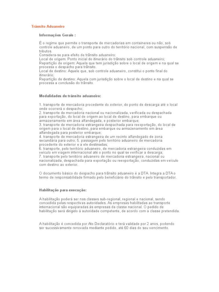 O documento bsico do despacho para trnsito aduaneiro a DTA. Integra a DTA o