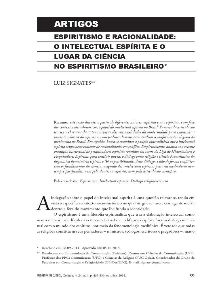 Palavras-chave: Espiritismo. Intelectual esprita. Dilogo religio-cincia