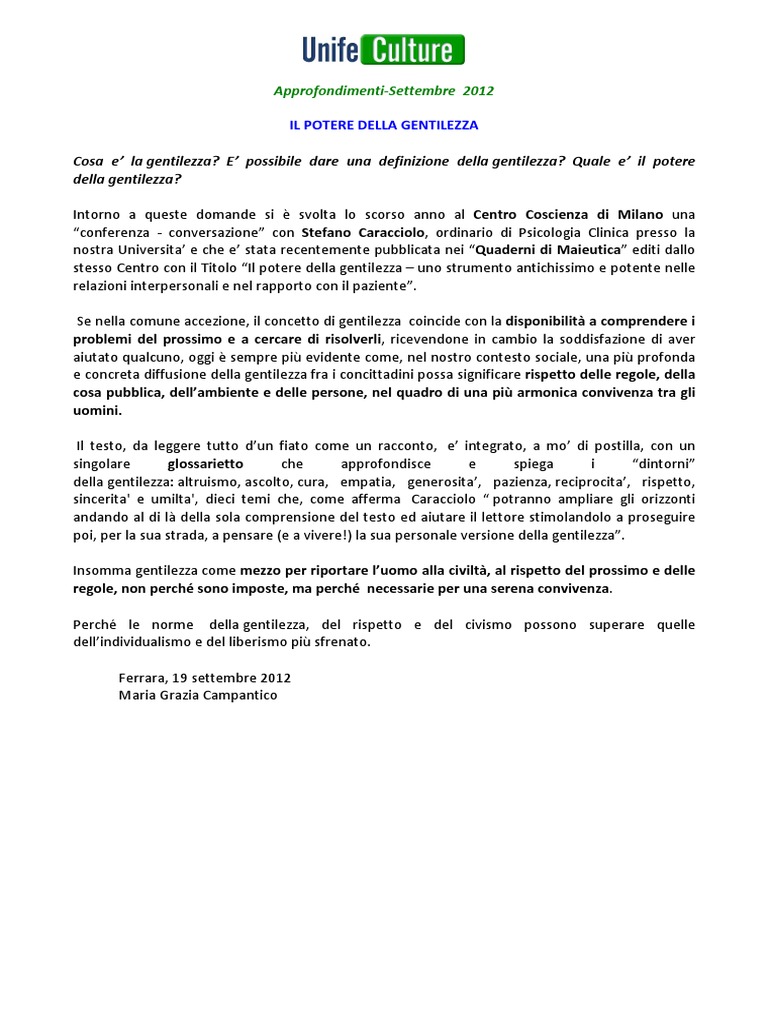 gentilezza. Se della sincerit gi qualcosa si detto nel corso della conferenza, a proposito della