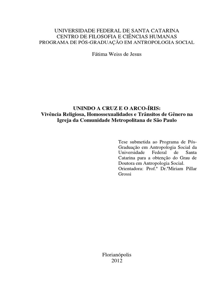 Henrique Mendes Ferreira que também fizeram parte do NIGS durante a realização de meu doutorado. Também pelo aprendizado e apoio financeiro nos projetos dos quais participei: Ensino Religioso e Gênero em Santa Catarina (PROSARE), Representações sobre Iniciação Sexual e Homossexualidade em escolas de Santa Catarina (Ministério da Saúde), Oficinas Papo Sério (PROEXT), Avaliação das Políticas Públicas para mulheres: processo de preparação das conferências de políticas públicas sobre mulheres em 2011 (SPM), todo meu agradecimento ao NIGS pelas experiências coletivas e interdisciplinares. Também às trocas realizadas no Grupo de Estudos Gênero e Religião, em 2010, com a parceria de Claudio Leandro e nos seminários de tese, diálogos fundamentais para a confecção desta tese. E, principalmente, pelas amizades conquistadas: “Eu entendo, você entende. Você torce por mim daí, eu torço por você daqui”. Também por isso, agradeço imensamente à minha orientadora Miriam Pillar Grossi, que tem oportunizado, através do NIGS, um ambiente acadêmico fértil, desafiador, interdisciplinar, engajado, que ultrapassa os muros da universidade e “suja suas mãos de barro” como dizia o professor Silvio Coelho dos Santos. Agradeço-a, sobretudo, por entender sua função formadora e fazê-la cumprir-se com doação, firmeza, olhar crítico e visão ampliada, mas também com afeto e reciprocidade. Agradeço especialmente pelo apoio nestes últimos meses para a realização do concurso docente da UFAM (obrigada por todo encorajamento) e pelo esforço e energia dispensados para a finalização da tese em tão pouco tempo. Agradeço a Inês Bernal pela revisão desta tese. Agradeço a André S. Musskopf, Maria Amélia Dickie e Alberto Groisman por terem participado de minha banca de qualificação. Agradeço a Maria Regina A. Lisbôa, minha orientadora na graduação e Maria Amélia S. Dickie orientadora no mestrado, por terem contribuído com minha formação antropológica e em gênero e religião, temas com os quais sigo desde o Trabalho de Conclusão de Curso e por terem aceitado tomar parte nesta banca. Da mesma forma, agradeço a Marcelo Natividade, Carlos Guilherme do Valle, Tânia Welter, Alberto Groisman pelos diálogos estabelecidos em diferentes momentos de minha trajetória e por aceitarem o convite para comporem a banca; À Antonella Tassinari e Miriam Aldana, pela leitura e por aceitarem ser suplentes. A todos e todas por fazerem parte desta importante etapa de minha formação e de minha vida.