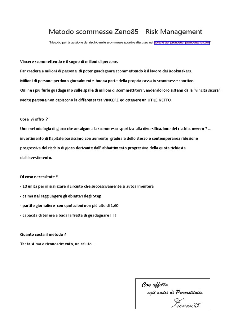 "Metodo per la gestione del rischio nelle scommesse sportive discusso nel portale dei pronostici [Link]"