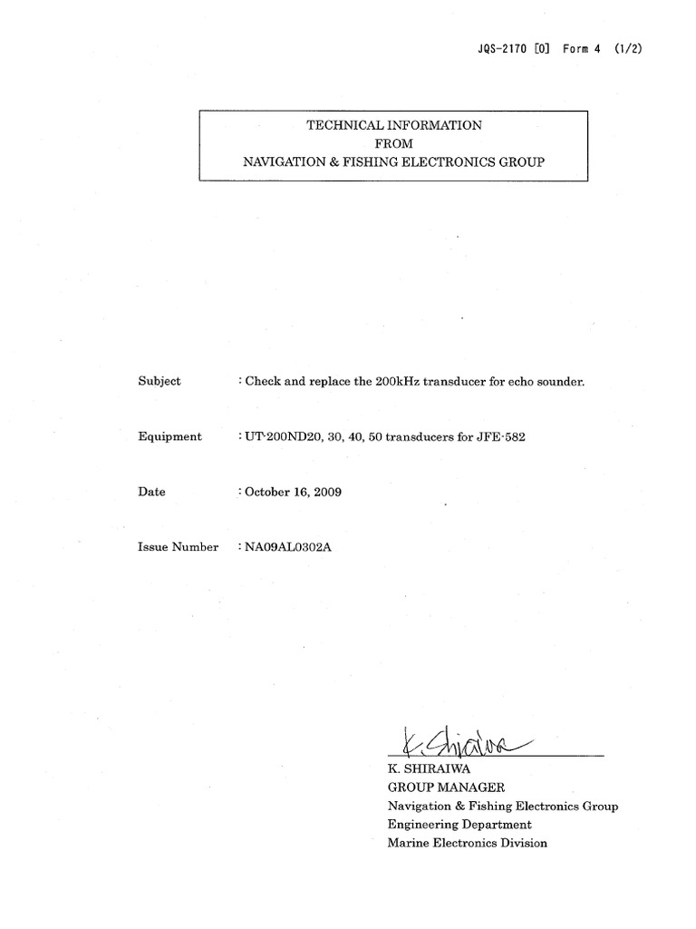 Check, replace and reject the 200kHz old type transducer for echo sounder.