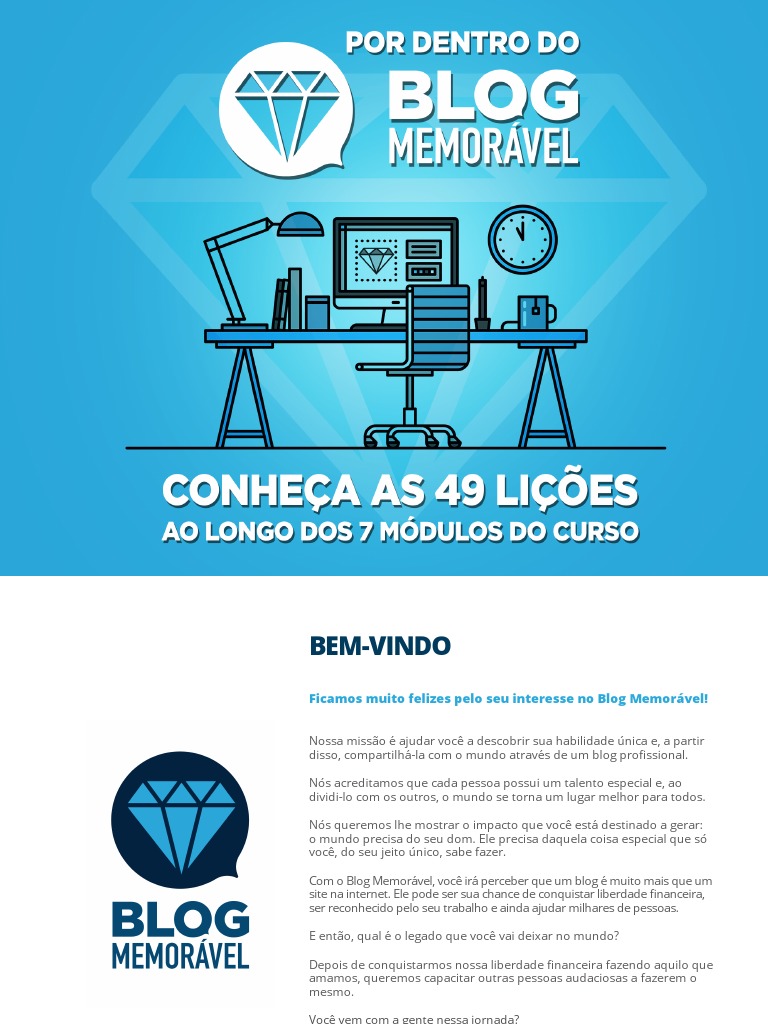 O Blog Memorável irá ajudá-lo a transformar o negócio dos seus sonhos em realidade. Ao todo, o curso possui sete módulos e cada módulo tem sete lições. O conteúdo será dado nos formatos de texto, vídeo e áudio.