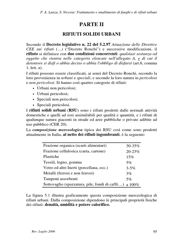 rifiuti urbani. Dalla composizione dipendono le principali propriet fisiche