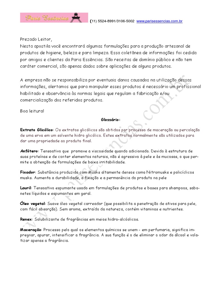 Nesta apostila voc encontrar algumas formulaes para a produo artesanal de