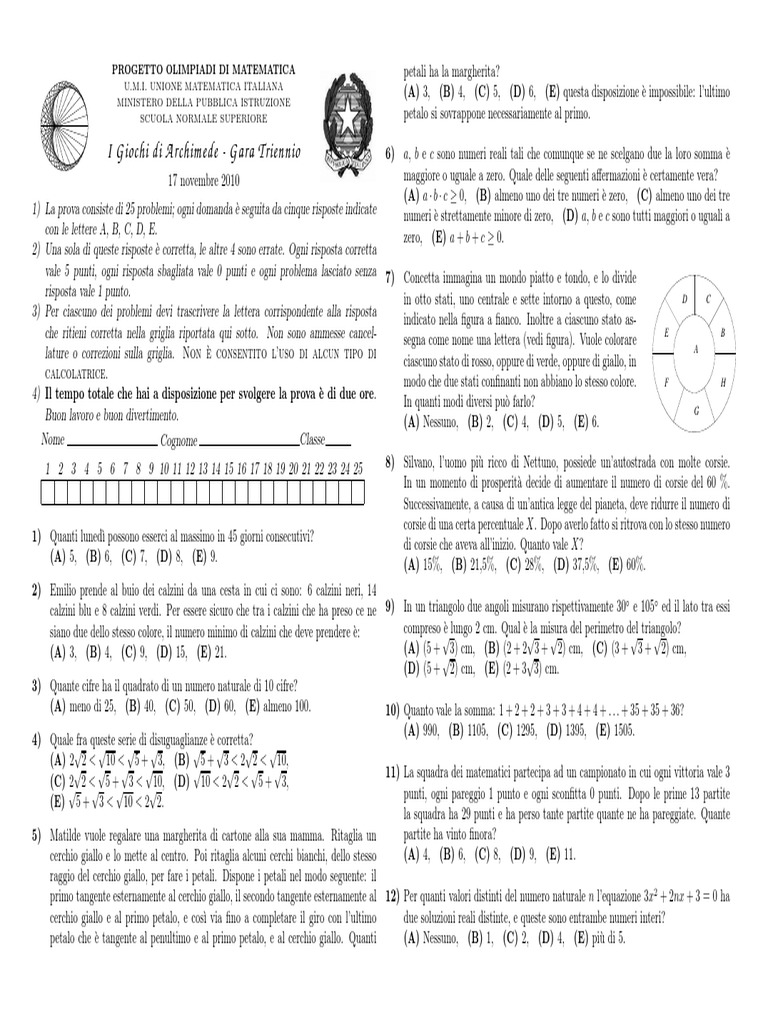 1) La prova consiste di 25 problemi; ogni domanda `e seguita da cinque risposte indicate