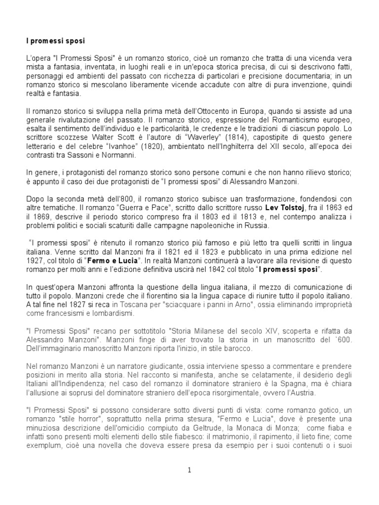 Lopera "I Promessi Sposi" un romanzo storico, cio un romanzo che tratta di una vicenda vera