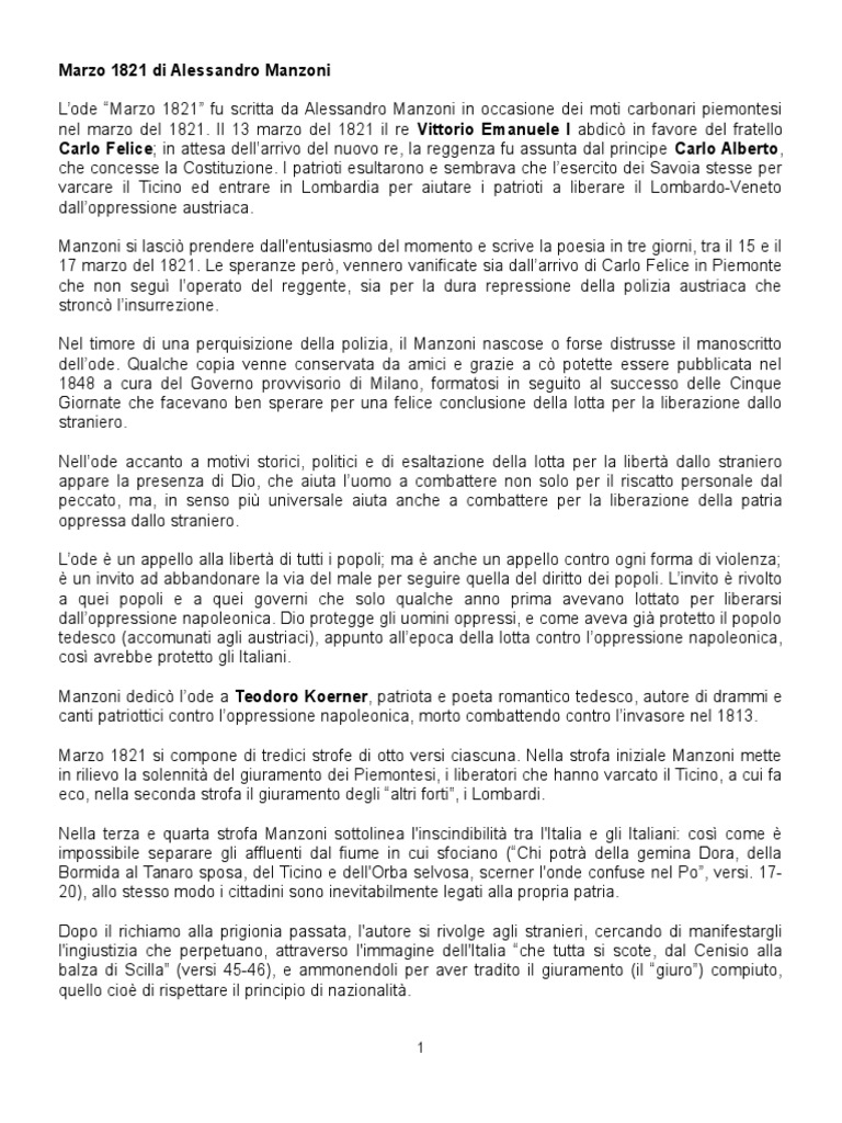 Marzo 1821 si compone di tredici strofe di otto versi ciascuna. Nella strofa iniziale Manzoni mette
