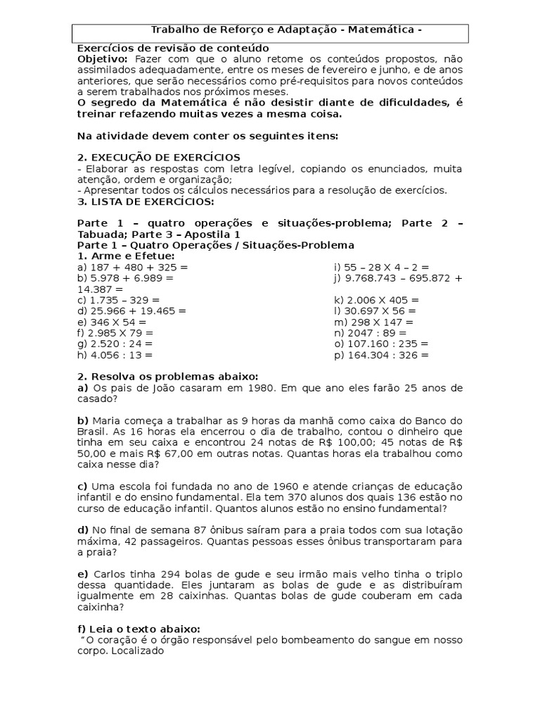 Trabalho de Reforo e Adaptao - Matemtica Exerccios de reviso de contedo
