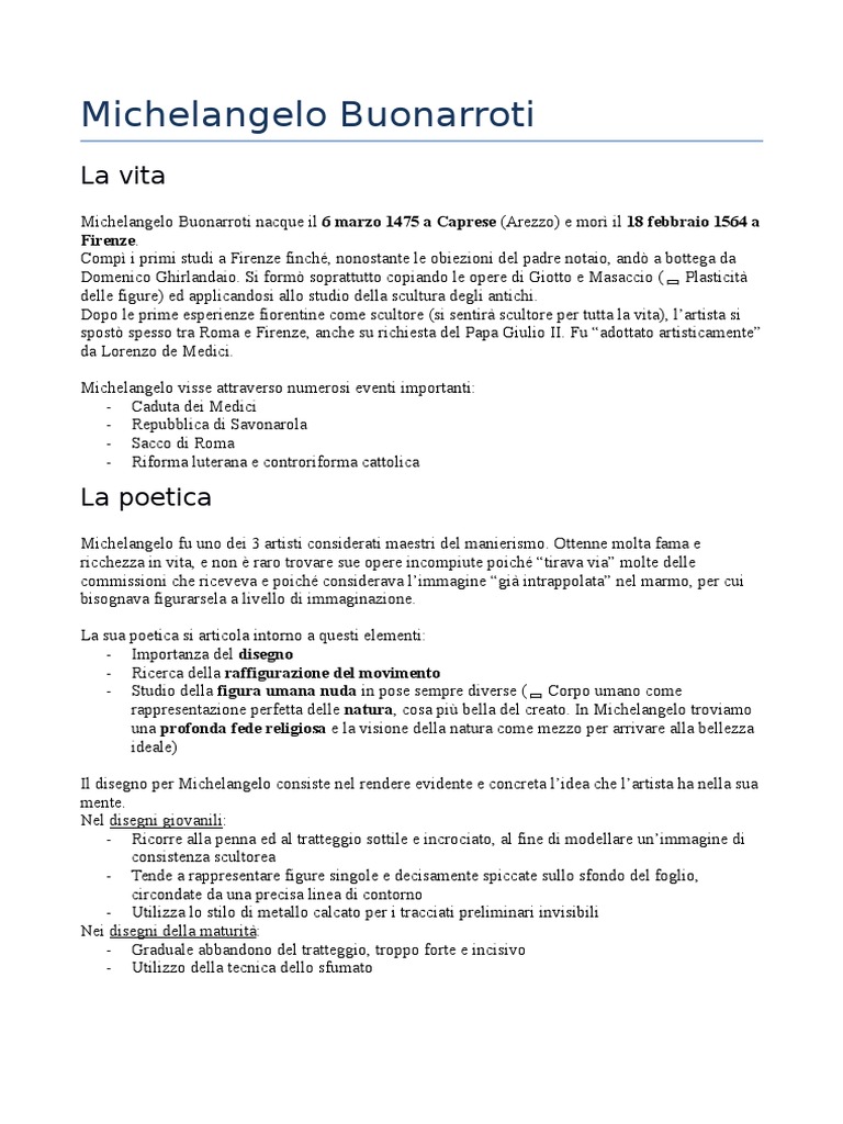 Michelangelo Buonarroti nacque il 6 marzo 1475 a Caprese (Arezzo) e mor il 18 febbraio 1564 a