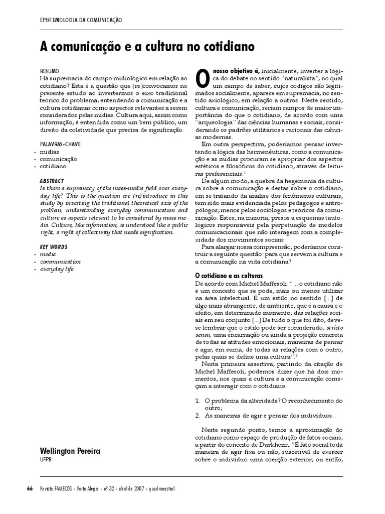 mados socialmente, aparece em supremacia, no sen- tido axiológico, em relação a outros. Neste sentido, cultura e comunicação, seriam campos de maior im- portância do que o cotidiano, de acordo com uma “arqueologia” das ciências humanas e sociais; consi- derando os padrões utilitários e racionais das ciênci- as modernas. Em outra perspectiva, poderíamos pensar inver- tendo a lógica das hermenêuticas, como a comunica- ção e as mídias procuram se apropriar dos aspectos estéticos e filosóficos do cotidiano, através de leitu- ras preferenciais. 1 De algum modo, a quebra da hegemonia da cultu- ra sobre a comunicação e destas sobre o cotidiano, em se tratando da análise dos fenômenos culturais,