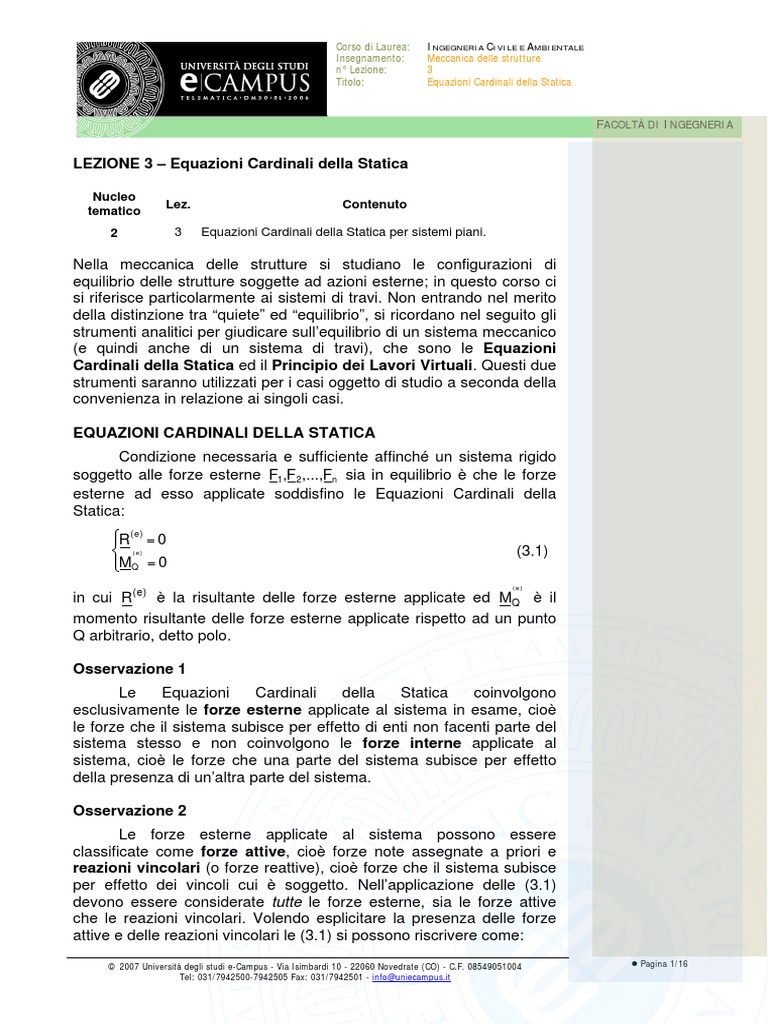 LEZIONE 3 Equazioni Cardinali della Statica