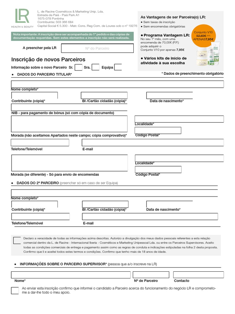 Ao enviar esta inscrio confirmo que informei o candidato a Parceiro acerca do funcionamento do negcio LR e comprometome a dar-lhe todo o meu apoio.