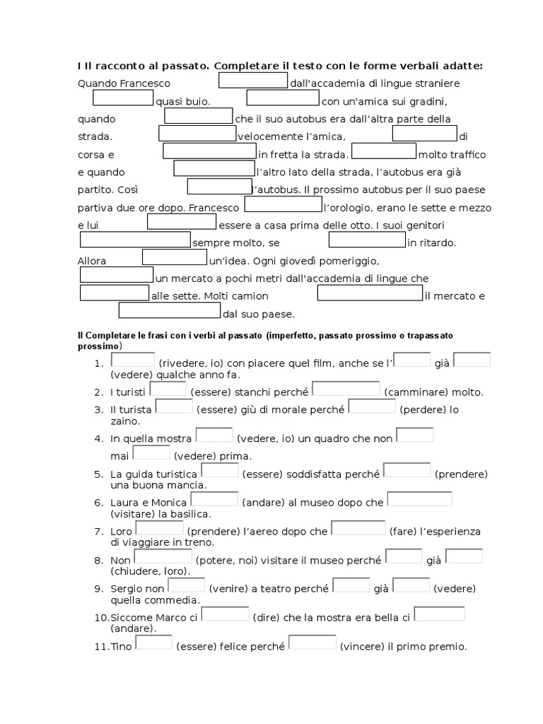 II Completare le frasi con i verbi al passato (imperfetto, passato prossimo o trapassato