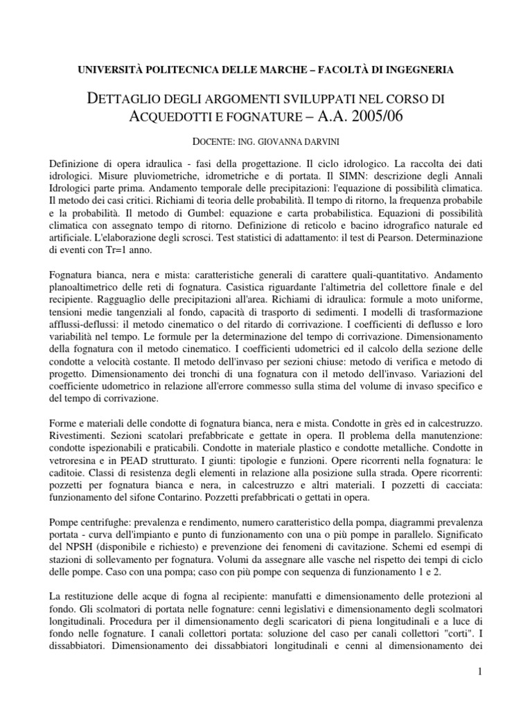 ACQUEDOTTI E FOGNATURE A.A. 2005/06